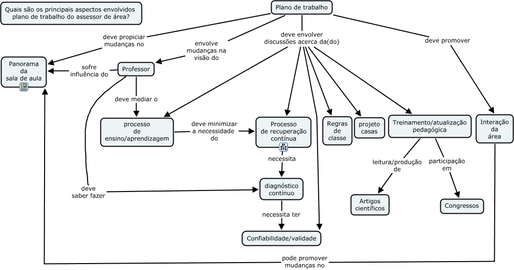 This Concept Map, created with IHMC CmapTools, has information related to: Plano de Trabalho, Professor deve mediar o processo de ensino/aprendizagem, Plano de trabalho deve envolver discussões acerca da(do) Confiabilidade/validade, Plano de trabalho deve envolver discussões acerca da(do) Processo de recuperação contínua, Plano de trabalho envolve mudanças na visão do Professor, Treinamento/atualização pedagógica leitura/produção de Artigos científicos, Plano de trabalho deve envolver discussões acerca da(do) processo de ensino/aprendizagem, Treinamento/atualização pedagógica participação em Congressos, Processo de recuperação contínua necessita diagnóstico contínuo, Plano de trabalho deve envolver discussões acerca da(do) projeto casas, Plano de trabalho deve promover Interação da área, Interação da área pode promover mudanças no Panorama da sala de aula, diagnóstico contínuo necessita ter Confiabilidade/validade, processo de ensino/aprendizagem deve minimizar a necessidade do Processo de recuperação contínua, Professor deve saber fazer diagnóstico contínuo, Professor sofre influência do Panorama da sala de aula, Plano de trabalho deve envolver discussões acerca da(do) Regras de classe, Plano de trabalho deve envolver discussões acerca da(do) Treinamento/atualização pedagógica, Plano de trabalho deve propiciar mudanças no Panorama da sala de aula