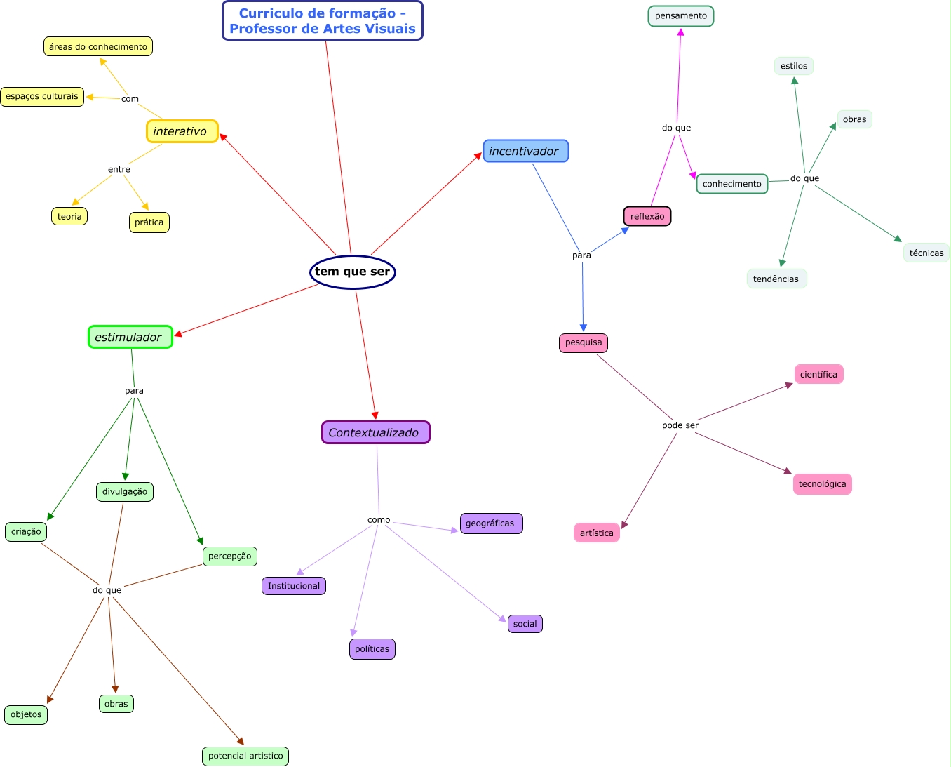 Esse mapa conceitual, produzido no IHMC CmapTools, tem a informação relacionada a: Curriculo, conhecimento do que estilos, divulgação do que potencial artistico, Curriculo de formação - Professor de Artes Visuais tem que ser incentivador, Contextualizado como políticas, conhecimento do que técnicas, divulgação do que objetos, estimulador para percepção, interativo com áreas do conhecimento, incentivador para reflexão, Curriculo de formação - Professor de Artes Visuais tem que ser Contextualizado, estimulador para divulgação, conhecimento do que obras, interativo entre teoria, conhecimento do que tendências, criação do que obras, Curriculo de formação - Professor de Artes Visuais tem que ser interativo, criação do que objetos, pesquisa pode ser tecnológica, reflexão do que pensamento, Contextualizado como social