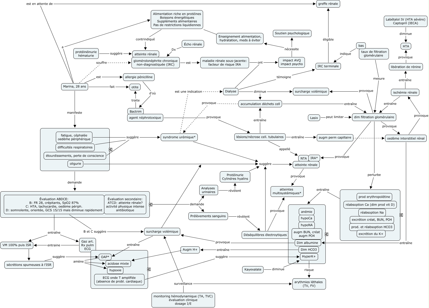 Cette carte de concepts créée avec IHMC CmapTools traite de: APSIC IRA2, Alimentation riche en protéines Boissons énergétiques Suppléments alimentaires Pas de restrictions liquidiennes contrindiqué atteinte rénale, OAP* amène hypoxie, Marina, 28 ans est allergie pénicilline, Marina, 28 ans fait otite, Dim albumine provoque surcharge volémique, surcharge volémique entraîne OAP*, monitoring hémodynamique (TA, TVC) évaluation clinique dosage I/E surveillance surcharge volémique, oedème interstitiel rénal entraîne Dim albumine, augm perm capillaire ???? oedème interstitiel rénal, Marina, 28 ans est en attente de greffe rénale, ???? entraîne ????, impact AVQ impact psycho nécessite Enseignement alimentation, hydratation, meds à éviter, monitoring hémodynamique (TA, TVC) évaluation clinique dosage I/E surveillance arythmies léthales (TV, FV), fatigue, céphalée oedème périphérique suggère syndrome urémique*, agent néphrotoxique provoque lésions/nécrose cell. tubulaires, Évaluation ABDCE: B: FR 28, crépitants, SpO2 87% C: HTA, tachycardie, oedème périph. D: somnolente, orientée, GCS 15/15 mais diminue rapidement B et C suggère surcharge volémique, Déséquilibres électroytiques suggère atteinte rénale, Enseignement alimentation, hydratation, meds à éviter ???? Alimentation riche en protéines Boissons énergétiques Suppléments alimentaires Pas de restrictions liquidiennes, Analyses urinaires révèlent Protéinurie Cylindres hyalins, syndrome urémique* suggère atteinte rénale