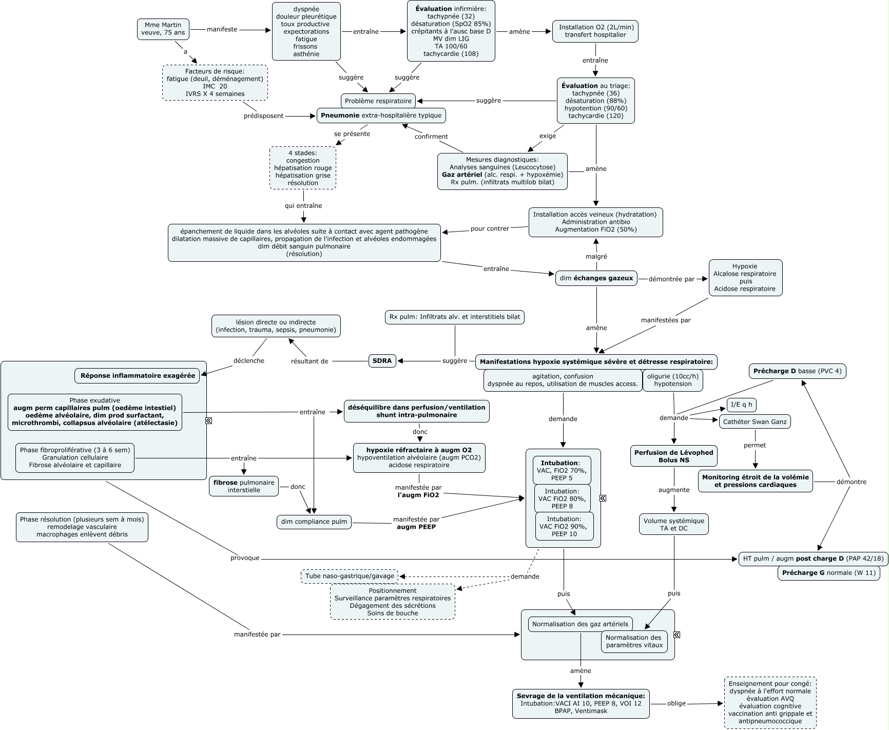 Cette carte de concepts créée avec IHMC CmapTools traite de: APSIC SDRA, Précharge D basse (PVC 4) demande Perfusion de Lévophed Bolus NS, Précharge D basse (PVC 4) demande Cathéter Swan Ganz, Manifestations hypoxie systémique sévère et détresse respiratoire: suggère SDRA, Monitoring étroit de la volémie et pressions cardiaques démontre Précharge D basse (PVC 4), Phase exudative augm perm capillaires pulm (oedème intestiel) oedème alvéolaire, dim prod surfactant, microthrombi, collapsus alvéolaire (atélectasie) entraîne dim compliance pulm, dyspnée douleur pleurétique toux productive expectorations fatigue frissons asthénie entraîne Évaluation infirmière: tachypnée (32) désaturation (SpO2 85%) crépitants à l'ausc base D MV dim LIG TA 100/60 tachycardie (108), oligurie (10cc/h) hypotension demande Perfusion de Lévophed Bolus NS, Installation accès veineux (hydratation) Administration antibio Augmentation FiO2 (50%) pour contrer épanchement de liquide dans les alvéoles suite à contact avec agent pathogène dilatation massive de capillaires, propagation de l'infection et alvéoles endommagées dim débit sanguin pulmonaire (résolution), Phase fibroproliférative (3 à 6 sem) Granulation cellulaire Fibrose alvéolaire et capillaire entraîne fibrose pulmonaire interstielle, ???? puis Normalisation des gaz artériels, fibrose pulmonaire interstielle donc dim compliance pulm, Évaluation au triage: tachypnée (36) désaturation (88%) hypotention (90/60) tachycardie (120) amène Installation accès veineux (hydratation) Administration antibio Augmentation FiO2 (50%), Évaluation au triage: tachypnée (36) désaturation (88%) hypotention (90/60) tachycardie (120) suggère Problème respiratoire, ???? demande Tube naso-gastrique/gavage, Mme Martin veuve, 75 ans a Facteurs de risque: fatigue (deuil, déménagement) IMC 20 IVRS X 4 semaines, oligurie (10cc/h) hypotension demande Cathéter Swan Ganz, dim échanges gazeux démontrée par Hypoxie Alcalose respiratoire puis Acidose respiratoire, ???? provoque HT pulm / augm post charge D (PAP 42/18), agitation, confusion dyspnée au repos, utilisation de muscles access. demande ????, Monitoring étroit de la volémie et pressions cardiaques démontre HT pulm / augm post charge D (PAP 42/18)