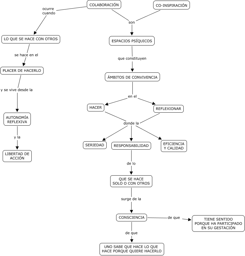 Este Cmap, tiene información relacionada con: Colaboración y co-inspiración, RESPONSABILIDAD de lo QUE SE HACE SOLO O CON OTROS, HACER donde la RESPONSABILIDAD, QUE SE HACE SOLO O CON OTROS surge de la CONSCIENCIA, ESPACIOS PSÍQUICOS que constituyen ÁMBITOS DE CONVIVENCIA, PLACER DE HACERLO y se vive desde la AUTONOMÍA REFLEXIVA, COLABORACIÓN son ESPACIOS PSÍQUICOS, CONSCIENCIA de que UNO SABE QUE HACE LO QUE HACE PORQUE QUIERE HACERLO, HACER donde la SERIEDAD, REFLEXIONAR donde la SERIEDAD, ÁMBITOS DE CONVIVENCIA en el HACER, CONSCIENCIA de que TIENE SENTIDO PORQUE HA PARTICIPADO EN SU GESTACIÓN, CO-INSPIRACIÓN son ESPACIOS PSÍQUICOS, REFLEXIONAR donde la RESPONSABILIDAD, HACER donde la EFICIENCIA Y CALIDAD, ÁMBITOS DE CONVIVENCIA en el REFLEXIONAR, LO QUE SE HACE CON OTROS se hace en el PLACER DE HACERLO, REFLEXIONAR donde la EFICIENCIA Y CALIDAD, AUTONOMÍA REFLEXIVA y la LIBERTAD DE ACCIÓN, COLABORACIÓN ocurre cuando LO QUE SE HACE CON OTROS