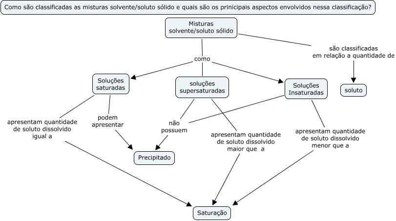 Esse mapa conceitual, produzido no IHMC CmapTools, tem a informação relacionada a: Classificação das soluções, soluções supersaturadas apresentam quantidade de soluto dissolvido maior que a Saturação, Misturas solvente/soluto sólido como Soluções Insaturadas, Soluções saturadas apresentam quantidade de soluto dissolvido igual a Saturação, Soluções Insaturadas apresentam quantidade de soluto dissolvido menor que a Saturação, Misturas solvente/soluto sólido como Soluções saturadas, Soluções saturadas podem apresentar Precipitado, Misturas solvente/soluto sólido como soluções supersaturadas, soluções supersaturadas não possuem Precipitado, Soluções Insaturadas não possuem Precipitado, Misturas solvente/soluto sólido são classificadas em relação a quantidade de soluto