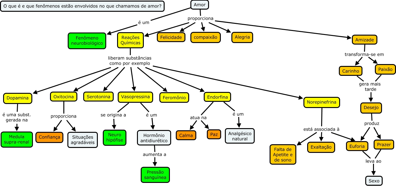 This Concept Map, created with IHMC CmapTools, has information related to: Química do Amor, Amor proporciona Reações Químicas, Oxitocina proporciona Situações agradáveis, Reações Químicas liberam substâncias como por exemplo Vasopressina, Desejo produz Euforia, Endorfina atua na Paz, Amizade transforma-se em Paixão, Reações Químicas liberam substâncias como por exemplo Norepinefrina, Reações Químicas liberam substâncias como por exemplo Endorfina, Reações Químicas liberam substâncias como por exemplo Oxitocina, Prazer leva ao Sexo, Norepinefrina está associada à Euforia, Amor proporciona Alegria, Amizade transforma-se em Carinho, Euforia leva ao Sexo, Amor é um Fenômeno neurobiológico, Paixão gera mais tarde Desejo, Reações Químicas liberam substâncias como por exemplo Feromônio, Vasopressina se origina a Neuro hipófise, Reações Químicas liberam substâncias como por exemplo Dopamina, Dopamina é uma subst. gerada na Medula supra-renal