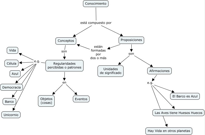Este Cmap, tiene información relacionada con: Conocimiento, Afirmaciones e.g. Hay Vida en otros planetas, Conceptos son Regularidades percibidas o patrones, Regularidades percibidas o patrones e.g. Célula, Conocimiento está compuesto por Conceptos, Regularidades percibidas o patrones e.g. Barco, Afirmaciones e.g. Las Aves tiene Huesos Huecos, Afirmaciones e.g. El Barco es Azul, Regularidades percibidas o patrones en Eventos, Regularidades percibidas o patrones e.g. Unicornio, Regularidades percibidas o patrones e.g. Vida, Regularidades percibidas o patrones e.g. Azul, Regularidades percibidas o patrones en Objetos (cosas), Proposiciones son Afirmaciones, Proposiciones son Unidades de significado, Proposiciones están formadas por dos o más Conceptos, Conocimiento está compuesto por Proposiciones, Regularidades percibidas o patrones e.g. Democracia