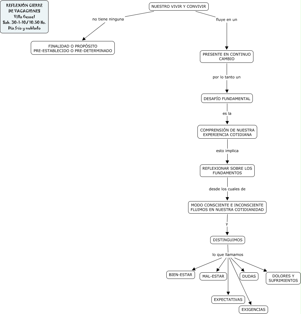 Este Cmap, tiene información relacionada con: Reflexión cierre vacaciones Gessel, DISTINGUIMOS lo que llamamos MAL-ESTAR, PRESENTE EN CONTINUO CAMBIO por lo tanto un DESAFÍO FUNDAMENTAL, REFLEXIONAR SOBRE LOS FUNDAMENTOS desde los cuales de MODO CONSCIENTE E INCONSCIENTE FLUIMOS EN NUESTRA COTIDIANIDAD, NUESTRO VIVIR Y CONVIVIR fluye en un PRESENTE EN CONTINUO CAMBIO, NUESTRO VIVIR Y CONVIVIR no tiene ninguna FINALIDAD O PROPÓSITO PRE-ESTABLECIDO O PRE-DETERMINADO, DISTINGUIMOS lo que llamamos DUDAS, COMPRENSIÓN DE NUESTRA EXPERIENCIA COTIDIANA esto implica REFLEXIONAR SOBRE LOS FUNDAMENTOS, DISTINGUIMOS lo que llamamos DOLORES Y SUFRIMIENTOS, DISTINGUIMOS lo que llamamos EXIGENCIAS, DESAFÍO FUNDAMENTAL es la COMPRENSIÓN DE NUESTRA EXPERIENCIA COTIDIANA, DISTINGUIMOS lo que llamamos BIEN-ESTAR, MODO CONSCIENTE E INCONSCIENTE FLUIMOS EN NUESTRA COTIDIANIDAD y DISTINGUIMOS, DISTINGUIMOS lo que llamamos EXPECTATIVAS