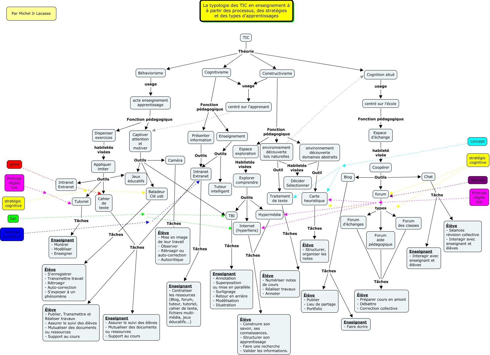 Cette carte de concepts créée avec IHMC CmapTools traite de: Typologie des TIC, Principe règles lois Hypermédia, Constructivisme Fonction pédagogique Espace exploration, Principe règles lois Carte heuristique, Appliquer imiter Outils Jeux éducatifs, stratégie cognitive Baladeur Clé usb, Constructivisme Fonction pédagogique environnement découverte lois naturelles, Cahier de texte Tâches Élève - Publier, Transmettre et Réaliser travaux - Assurer le suivi des élèves - Mutualiser des documents ou ressources - Support au cours, Intranet Extranet Tâches Enseignant - Assurer le suivi des élèves - Mutualiser des documents ou ressources - Support au cours, Chat Tâche Enseignant - Interagir avec enseignant et élèves, Coopérer Outils forum, acte enseignement apprentissage Fonction pédagogique Dispenser exercices, TBI Tâches Enseignant - Annotation - Superposition ou mise en parallèle - Surlignage - Retour en arrière - Modèlisation - Illustration, Espace d'échange habileté visée Coopérer, Appliquer imiter Outils Tutoriel, Enseignement Outils Tuteur intelligent, Coopérer Outils Blog, fait Internet (hyperliens), Blog Tâches Élève - Publier - Lieu de partage - Portfolio, Dispenser exercices habiletés visées Appliquer imiter, environnement découverte lois naturelles Habiletés visées Décider Sélectionner