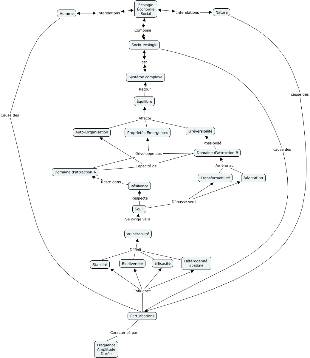 This Concept Map, created with IHMC CmapTools, has information related to: Carte concept 20100213, Domaine d'attraction A Capacité de Auto-Organisation, Domaine d'attraction B Possibilité Irréversibilité, Équilibre Retour Système complexe, Homme Cause des Perturbations, Transformabilité Amène au Domaine d'attraction B, Perturbations Influence Hétérogénité spatiale, Écologie Économie Social Compose Socio-écologie, Seuil Respecte Résilience, Auto-Organisation Affecte Équilibre, Vulnérabilité Se dirige vers Seuil, Propriétés Émergentes Affecte Équilibre, Domaine d'attraction B Développe des Propriétés Émergentes, Hétérogénité spatiale Définit Vulnérabilité, Perturbations Influence Stabilité, Socio-écologie est Système complexe, Résilience Reste dans Domaine d'attraction A, Nature cause des Perturbations, Seuil Dépasse seuil Adaptation, Écologie Économie Social Interelations Nature, Seuil Dépasse seuil Transformabilité