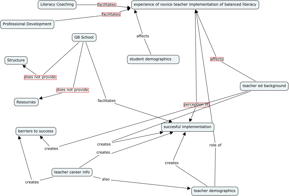 This Concept Map, created with IHMC CmapTools, has information related to: Joanne Smith - Moberly research project, student demographics affects experience of novice teacher implementation of balanced literacy, teacher career info creates barriers to success, Literacy Coaching facilitates experience of novice teacher implementation of balanced literacy, teacher career info creates succesful implementation, teacher demographics role of experience of novice teacher implementation of balanced literacy, teacher ed background creates barriers to success, experience of novice teacher implementation of balanced literacy perception of succesful implementation, GB School does not provide Structure, teacher career info also teacher demographics, GB School does not provide Resources, teacher ed background creates succesful implementation, GB School facilitates succesful implementation, teacher ed background affects experience of novice teacher implementation of balanced literacy, teacher demographics creates succesful implementation, Professional Development facilitates experience of novice teacher implementation of balanced literacy