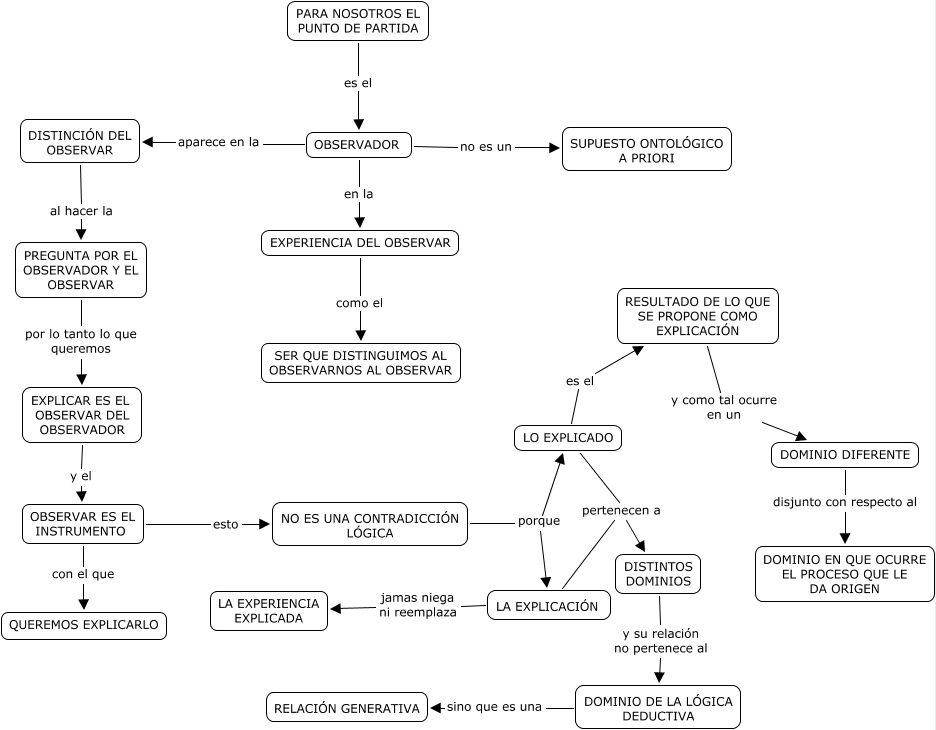 Este Cmap, tiene información relacionada con: EL PUNTO DE PARTIDA PARA NOSOTROS, OBSERVAR ES EL INSTRUMENTO esto NO ES UNA CONTRADICCIÓN LÓGICA, LO EXPLICADO pertenecen a DISTINTOS DOMINIOS, OBSERVADOR no es un SUPUESTO ONTOLÓGICO A PRIORI, PARA NOSOTROS EL PUNTO DE PARTIDA es el OBSERVADOR, DOMINIO DIFERENTE disjunto con respecto al DOMINIO EN QUE OCURRE EL PROCESO QUE LE DA ORIGEN, EXPLICAR ES EL OBSERVAR DEL OBSERVADOR y el OBSERVAR ES EL INSTRUMENTO, NO ES UNA CONTRADICCIÓN LÓGICA porque LO EXPLICADO, LO EXPLICADO es el RESULTADO DE LO QUE SE PROPONE COMO EXPLICACIÓN, PREGUNTA POR EL OBSERVADOR Y EL OBSERVAR por lo tanto lo que queremos EXPLICAR ES EL OBSERVAR DEL OBSERVADOR, RESULTADO DE LO QUE SE PROPONE COMO EXPLICACIÓN y como tal ocurre en un DOMINIO DIFERENTE, DOMINIO DE LA LÓGICA DEDUCTIVA sino que es una RELACIÓN GENERATIVA, DISTINTOS DOMINIOS y su relación no pertenece al DOMINIO DE LA LÓGICA DEDUCTIVA, DISTINCIÓN DEL OBSERVAR al hacer la PREGUNTA POR EL OBSERVADOR Y EL OBSERVAR, OBSERVADOR aparece en la DISTINCIÓN DEL OBSERVAR, NO ES UNA CONTRADICCIÓN LÓGICA porque LA EXPLICACIÓN, EXPERIENCIA DEL OBSERVAR como el SER QUE DISTINGUIMOS AL OBSERVARNOS AL OBSERVAR, LA EXPLICACIÓN jamas niega ni reemplaza LA EXPERIENCIA EXPLICADA, OBSERVAR ES EL INSTRUMENTO con el que QUEREMOS EXPLICARLO, LA EXPLICACIÓN pertenecen a DISTINTOS DOMINIOS, OBSERVADOR en la EXPERIENCIA DEL OBSERVAR