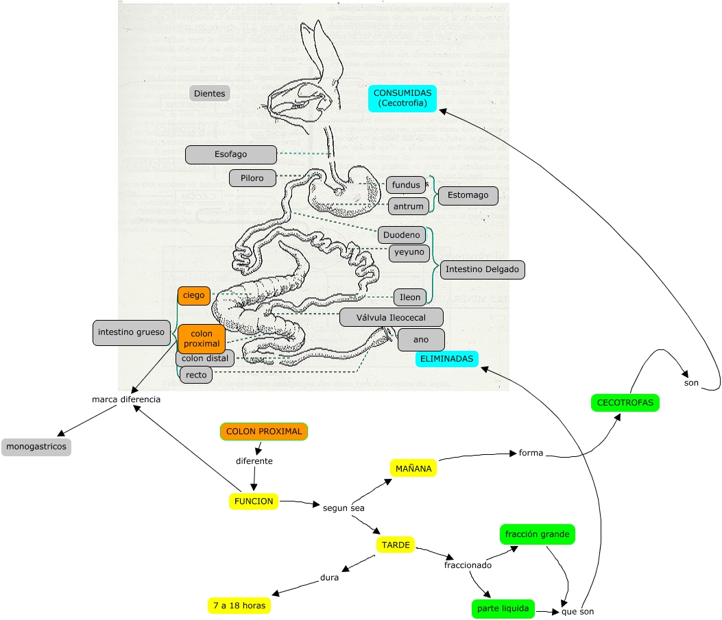 Este Cmap, tiene información relacionada con: TRACTO DIGESTIVO CONEJOS, TARDE fraccionado fracción grande, FUNCION segun sea TARDE, MAÑANA forma CECOTROFAS, fracción grande que son ELIMINADAS, FUNCION segun sea MAÑANA, parte liquida que son ELIMINADAS, TARDE dura 7 a 18 horas, CECOTROFAS son CONSUMIDAS (Cecotrofia), FUNCION marca diferencia monogastricos, colon proximal marca diferencia monogastricos, TARDE fraccionado parte liquida, COLON PROXIMAL diferente FUNCION