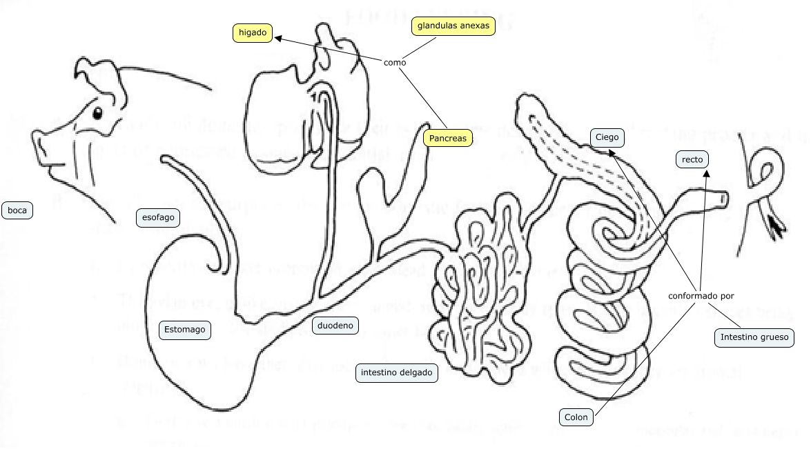 Este Cmap, tiene información relacionada con: TRACTO DIGESTIVO CERDO, Intestino grueso conformado por Ciego, glandulas anexas como higado, Intestino grueso conformado por Colon, glandulas anexas como Pancreas, Intestino grueso conformado por recto