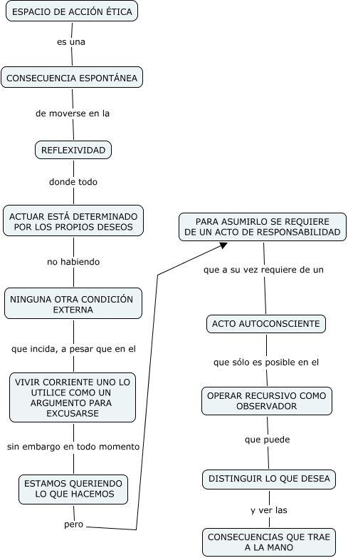 Este Cmap, tiene información relacionada con: Espacio de acción ética, NINGUNA OTRA CONDICIÓN EXTERNA que incida, a pesar que en el VIVIR CORRIENTE UNO LO UTILICE COMO UN ARGUMENTO PARA EXCUSARSE, ESPACIO DE ACCIÓN ÉTICA es una CONSECUENCIA ESPONTÁNEA, VIVIR CORRIENTE UNO LO UTILICE COMO UN ARGUMENTO PARA EXCUSARSE sin embargo en todo momento ESTAMOS QUERIENDO LO QUE HACEMOS, ACTUAR ESTÁ DETERMINADO POR LOS PROPIOS DESEOS no habiendo NINGUNA OTRA CONDICIÓN EXTERNA, ACTO AUTOCONSCIENTE que sólo es posible en el OPERAR RECURSIVO COMO OBSERVADOR, OPERAR RECURSIVO COMO OBSERVADOR que puede DISTINGUIR LO QUE DESEA, CONSECUENCIA ESPONTÁNEA de moverse en la REFLEXIVIDAD, ESTAMOS QUERIENDO LO QUE HACEMOS pero PARA ASUMIRLO SE REQUIERE DE UN ACTO DE RESPONSABILIDAD, PARA ASUMIRLO SE REQUIERE DE UN ACTO DE RESPONSABILIDAD que a su vez requiere de un ACTO AUTOCONSCIENTE, REFLEXIVIDAD donde todo ACTUAR ESTÁ DETERMINADO POR LOS PROPIOS DESEOS, DISTINGUIR LO QUE DESEA y ver las CONSECUENCIAS QUE TRAE A LA MANO