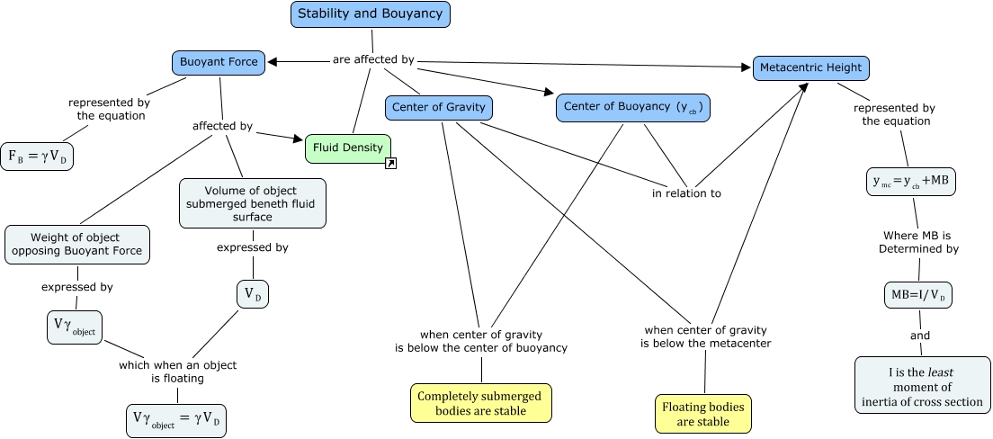 This Concept Map, created with IHMC CmapTools, has information related to: Stability in Boyancy, Buoyant Force affected by Volume of object submerged beneth fluid surface, Center of Gravity are affected by Fluid Density, Buoyant Force affected by Fluid Density, Center of Gravity are affected by <math xmlns="http://www.w3.org/1998/Math/MathML"> <mrow> <mtext> Center of Buoyancy </mtext> <mmultiscripts> <mtext> (y </mtext> <mtext> cb </mtext> <none/> </mmultiscripts> <mtext> ) </mtext> </mrow> </math>, <math xmlns="http://www.w3.org/1998/Math/MathML"> <mrow> <mtext> Center of Buoyancy </mtext> <mmultiscripts> <mtext> (y </mtext> <mtext> cb </mtext> <none/> </mmultiscripts> <mtext> ) </mtext> </mrow> </math> in relation to Metacentric Height, Stability and Bouyancy are affected by <math xmlns="http://www.w3.org/1998/Math/MathML"> <mrow> <mtext> Center of Buoyancy </mtext> <mmultiscripts> <mtext> (y </mtext> <mtext> cb </mtext> <none/> </mmultiscripts> <mtext> ) </mtext> </mrow> </math>, <math xmlns="http://www.w3.org/1998/Math/MathML"> <mmultiscripts> <mtext> y </mtext> <mtext> mc </mtext> <none/> </mmultiscripts> <mtext> = </mtext> <mmultiscripts> <mtext> y </mtext> <mtext> cb </mtext> <none/> </mmultiscripts> <mtext> +MB </mtext> </math> Where MB is Determined by <math xmlns="http://www.w3.org/1998/Math/MathML"> <mrow> <mtext> MB=I/ </mtext> <mmultiscripts> <mtext> V </mtext> <mtext> D </mtext> <none/> </mmultiscripts> </mrow> </math>, Buoyant Force represented by the equation <math xmlns="http://www.w3.org/1998/Math/MathML"> <mrow> <mmultiscripts> <mtext> F </mtext> <mtext> B </mtext> <none/> </mmultiscripts> <mtext> = γ </mtext> <mmultiscripts> <mtext> V </mtext> <mtext> D </mtext> <none/> </mmultiscripts> </mrow> </math>, Weight of object opposing Buoyant Force expressed by <math xmlns="http://www.w3.org/1998/Math/MathML"> <mrow> <mtext> V </mtext> <mmultiscripts> <mtext> γ </mtext> <mtext> object </mtext> <none/> </mmultiscripts> </mrow> </math>, Center of Gravity when center of gravity is below the center of buoyancy Completely submerged bodies are stable, <math xmlns="http://www.w3.org/1998/Math/MathML"> <mrow> <mtext> V </mtext> <mmultiscripts> <mtext> γ </mtext> <mtext> object </mtext> <none/> </mmultiscripts> </mrow> </math> which when an object is floating <math xmlns="http://www.w3.org/1998/Math/MathML"> <mrow> <mtext> V </mtext> <mmultiscripts> <mtext> γ </mtext> <mtext> object </mtext> <none/> </mmultiscripts> <mtext> = </mtext> <mrow> <mtext> γ </mtext> <mmultiscripts> <mtext> V </mtext> <mtext> D </mtext> <none/> </mmultiscripts> </mrow> </mrow> </math>, <math xmlns="http://www.w3.org/1998/Math/MathML"> <mrow> <mtext> Center of Buoyancy </mtext> <mmultiscripts> <mtext> (y </mtext> <mtext> cb </mtext> <none/> </mmultiscripts> <mtext> ) </mtext> </mrow> </math> when center of gravity is below the center of buoyancy Completely submerged bodies are stable, Center of Gravity <math xmlns="http://www.w3.org/1998/Math/MathML"> <mrow> <mtext> when center of gravity