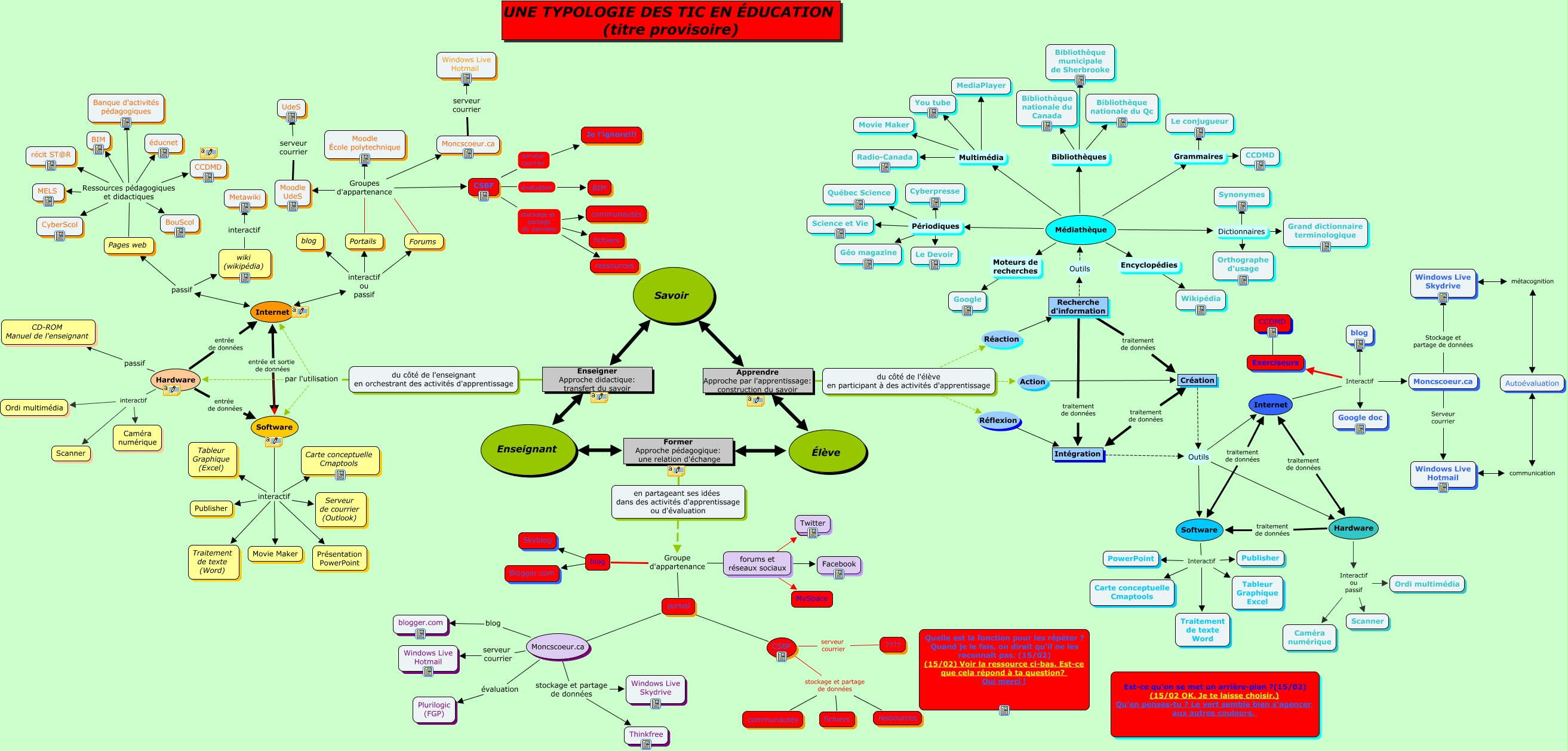 Cette carte de concepts créée avec IHMC CmapTools traite de: Typologie_TIC_Équipe_2_maj_15-02_23h42, blog ???? Skyblog, Forums Groupes d'appartenance Moodle École polytechnique, Recherche d'information traitement de données Création, wiki (wikipédia) interactif Metawiki, Création Outils Internet, Pages web Ressources pédagogiques et didactiques récit ST@R, du côté de l'élève en participant à des activités d'apprentissage Réaction Recherche d'information, Médiathèque Bibliothèques Bibliothèque nationale du Qc, Médiathèque Périodiques Le Devoir, Médiathèque Périodiques Québec Science, Médiathèque Périodiques Science et Vie, Software interactif Publisher, forums et réseaux sociaux ???? ????, du côté de l'enseignant en orchestrant des activités d'apprentissage par l'utilisation Hardware, Hardware entrée de données Internet, Savoir Apprendre Approche par l'apprentissage: construction du savoir du côté de l'élève en participant à des activités d'apprentissage, Software interactif Traitement de texte (Word), Hardware interactif Caméra numérique, Intégration Outils Internet, Moncscoeur.ca serveur courrier Windows Live Hotmail