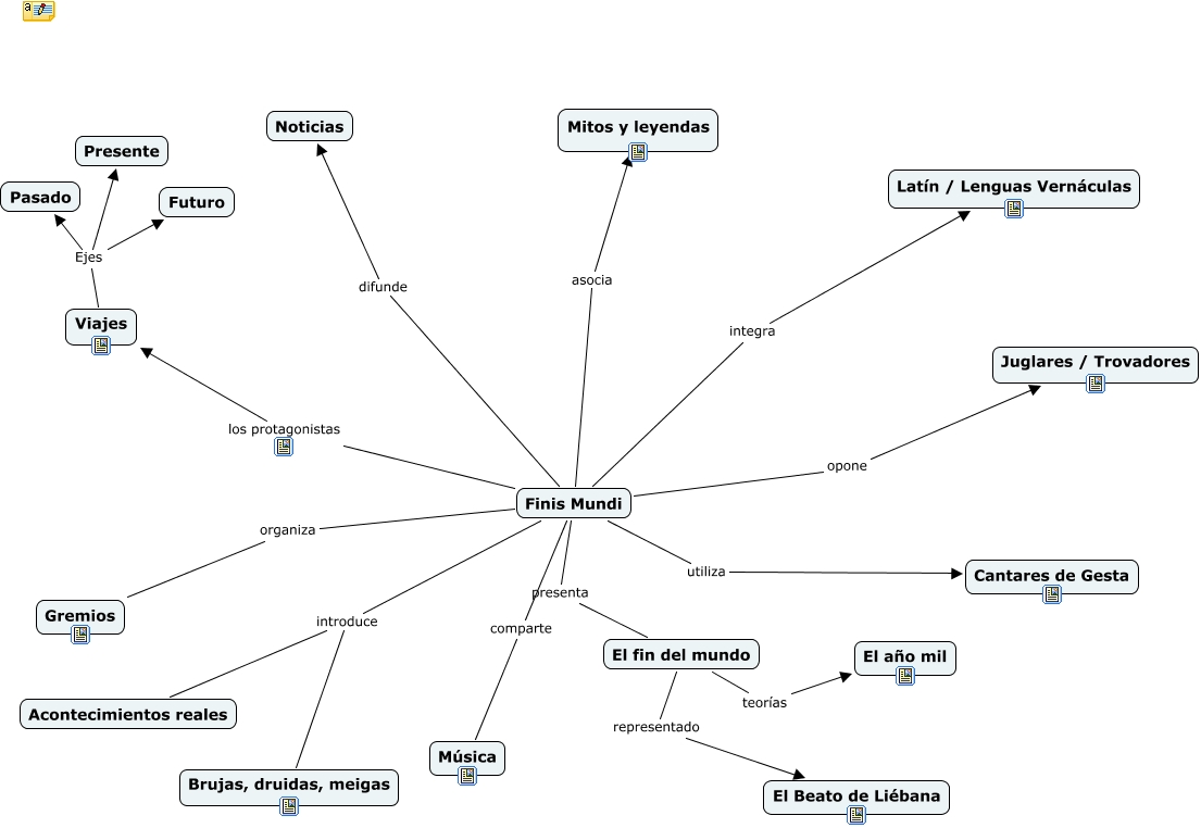 Este Cmap, tiene información relacionada con: Finis Mundi, Finis Mundi asocia Mitos y leyendas, Finis Mundi difunde Noticias, El fin del mundo teorías El año mil, Finis Mundi comparte Música, Finis Mundi integra Latín / Lenguas Vernáculas, El fin del mundo representado El Beato de Liébana, Finis Mundi presenta El fin del mundo, Viajes Ejes Presente, Viajes Ejes Futuro, Finis Mundi opone Juglares / Trovadores, Finis Mundi introduce Acontecimientos reales, Finis Mundi utiliza Cantares de Gesta, Finis Mundi introduce Brujas, druidas, meigas, Viajes Ejes Pasado, Finis Mundi organiza Gremios, Finis Mundi los protagonistas Viajes