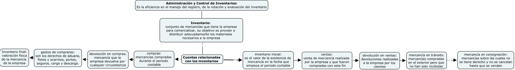 Este Cmap, tiene información relacionada con: tipos de inventario, compras: mercancías compradas durante el periodo contable . devolución en compras: mercancía que la empresa devuelve por cualquier circunstancia, mercancía en tránsito: mercancías compradas en el exterior pero que no han sido recibidas. . mercancía en consignación: mercancías sobre las cuales no se tiene derecho y no se cancelan hasta que se vendan, Cuentas relacionadas con los inventarios . inventario inicial: es el valor de la existencia de mercancía en la fecha que empieza el periodo contable, devolución en compras: mercancía que la empresa devuelve por cualquier circunstancia . gastos de compraras: son los derechos de aduana, fletes y acarreos, portes, seguros, carga y descarga., Administración y Control de Inventarios: Es la eficiencia en el manejo del registro, de la rotación y evaluación del inventario . Inventario: conjunto de mercancías que tiene la empresa para comercializar, su objetivo es proveer o distribuir adecuadamente los materiales necesarios a la empresa, Cuentas relacionadas con los inventarios . inventario inicial: es el valor de la existencia de mercancía en la fecha que empieza el periodo contable, gastos de compraras: son los derechos de aduana, fletes y acarreos, portes, seguros, carga y descarga. . Inventario final: valoración física de la mercancía de la empresa, devolución en ventas: devoluciones realizadas a la empresa por los clientes ???? mercancía en tránsito: mercancías compradas en el exterior pero que no han sido recibidas., ventas: venta de mercancía realizada por la empresa y que fueron compradas con este fin ???? devolución en ventas: devoluciones realizadas a la empresa por los clientes, inventario inicial: es el valor de la existencia de mercancía en la fecha que empieza el periodo contable ???? ventas: venta de mercancía realizada por la empresa y que fueron compradas con este fin, Inventario: conjunto de mercancías que tiene la empresa para comercializar, su objetivo es proveer o distribuir adecuadamente los materiales necesarios a la empresa . Cuentas relacionadas con los inventarios, Cuentas relacionadas con los inventarios . compras: mercancías compradas durante el periodo contable