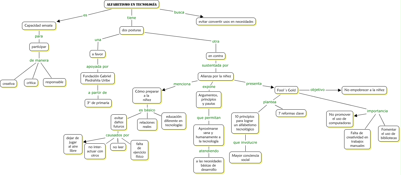 Este Cmap, tiene información relacionada con: Ruth Ugarte Alfabetismo en Tec, no leer causados por falta de ejercicio físico, Alfabetismo en tecnología es Capacidad sensata, Alfabetismo en tecnología tiene dos posturas, Alianza por la niñez menciona Cómo preparar a la niñez, participar de manera critica, Fool´s Gold importancia No promover el uso de computadoras, evitar daños futuros causados por no leer, evitar daños futuros causados por no inter- actuar con otros, Fool´s Gold objetivo No empobrecer a la niñez, 10 principios para lograr un alfabetismo tecnológico que involucre Mayor conciencia social, Alianza por la niñez presenta Fool´s Gold, Alianza por la niñez expone Argumentos, principios y pautas, no leer causados por no inter- actuar con otros, Fool´s Gold plantea 10 principios para lograr un alfabetismo tecnológico, Cómo preparar a la niñez es básico educación diferente en tecnologías, Argumentos, principios y pautas que permitan Aproximarse sana y humanamente a la tecnología, no leer causados por dejar de jugar al aire libre, en contra sustentada por Alianza por la niñez, dos posturas otra en contra, Fundación Gabriel Piedrahita Uribe a partir de 3° de primaria