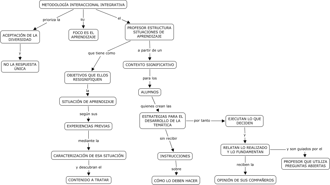 Este Cmap, tiene información relacionada con: Metodología interaccional integrativa, RELATAN LO REALIZADO Y LO FUNDAMENTAN reciben la OPINIÓN DE SUS COMPAÑEROS, ESTRATEGIAS PARA EL DESARROLLO DE LA TEMÁTICA por tanto EJECUTAN LO QUE DECIDEN, ACEPTACIÓN DE LA DIVERSIDAD y NO LA RESPUESTA ÚNICA, RELATAN LO REALIZADO Y LO FUNDAMENTAN y son guiados por el PROFESOR QUE UTILIZA PREGUNTAS ABIERTAS, ALUMNOS quienes crean las ESTRATEGIAS PARA EL DESARROLLO DE LA TEMÁTICA, METODOLOGÍA INTERACCIONAL INTEGRATIVA prioriza la ACEPTACIÓN DE LA DIVERSIDAD, EXPERIENCIAS PREVIAS mediante la CARACTERIZACIÓN DE ESA SITUACIÓN, METODOLOGÍA INTERACCIONAL INTEGRATIVA el PROFESOR ESTRUCTURA SITUACIONES DE APRENDIZAJE, ESTRATEGIAS PARA EL DESARROLLO DE LA TEMÁTICA sin recibir INSTRUCCIONES, METODOLOGÍA INTERACCIONAL INTEGRATIVA su FOCO ES EL APRENDIZAJE, CONTEXTO SIGNIFICATIVO para los ALUMNOS, SITUACIÓN DE APRENDIZAJE según sus EXPERIENCIAS PREVIAS, CARACTERIZACIÓN DE ESA SITUACIÓN y descubran el CONTENIDO A TRATAR, PROFESOR ESTRUCTURA SITUACIONES DE APRENDIZAJE a partir de un CONTEXTO SIGNIFICATIVO, OBJETIVOS QUE ELLOS RESIGNIFIQUEN la SITUACIÓN DE APRENDIZAJE, EJECUTAN LO QUE DECIDEN y RELATAN LO REALIZADO Y LO FUNDAMENTAN, INSTRUCCIONES sobre CÓMO LO DEBEN HACER, PROFESOR ESTRUCTURA SITUACIONES DE APRENDIZAJE que tiene como OBJETIVOS QUE ELLOS RESIGNIFIQUEN