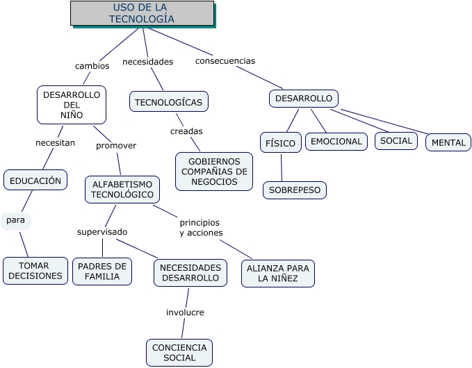 Este Cmap, tiene información relacionada con: USO DE LA TECNOLOGÍA, para ???? TOMAR DECISIONES, DESARROLLO ???? EMOCIONAL, DESARROLLO DEL NIÑO necesitan para, USO DE LA TECNOLOGÍA consecuencias DESARROLLO, DESARROLLO ???? SOCIAL, FÍSICO ???? SOBREPESO, DESARROLLO DEL NIÑO promover ALFABETISMO TECNOLÓGICO, TECNOLOGÍCAS creadas GOBIERNOS COMPAÑIAS DE NEGOCIOS, USO DE LA TECNOLOGÍA necesidades TECNOLOGÍCAS, NECESIDADES DESARROLLO involucre CONCIENCIA SOCIAL, ALFABETISMO TECNOLÓGICO principios y acciones ALIANZA PARA LA NIÑEZ, ALFABETISMO TECNOLÓGICO supervisado NECESIDADES DESARROLLO, USO DE LA TECNOLOGÍA cambios DESARROLLO DEL NIÑO, DESARROLLO ???? MENTAL, DESARROLLO ???? FÍSICO, ALFABETISMO TECNOLÓGICO supervisado PADRES DE FAMILIA