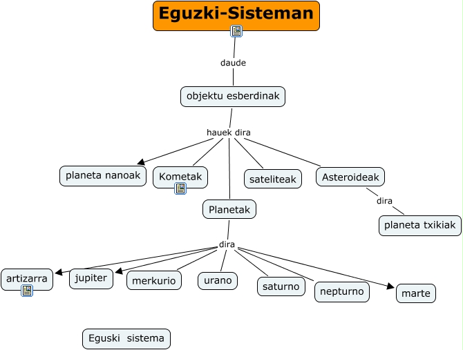 IHMC CmapTools-ekin sortu den kontzeptu-mapa honek honi buruzko informazioa du: eguzki_sistema_isaias_sonia, Eguzki-Sisteman daude objektu esberdinak, objektu esberdinak hauek dira planeta nanoak, Planetak dira merkurio, Planetak dira marte, objektu esberdinak hauek dira sateliteak, Planetak dira nepturno, Planetak dira artizarra, objektu esberdinak hauek dira Asteroideak, Planetak dira urano, Planetak dira jupiter, objektu esberdinak hauek dira Kometak, objektu esberdinak hauek dira Planetak, Asteroideak dira planeta txikiak, Planetak dira saturno