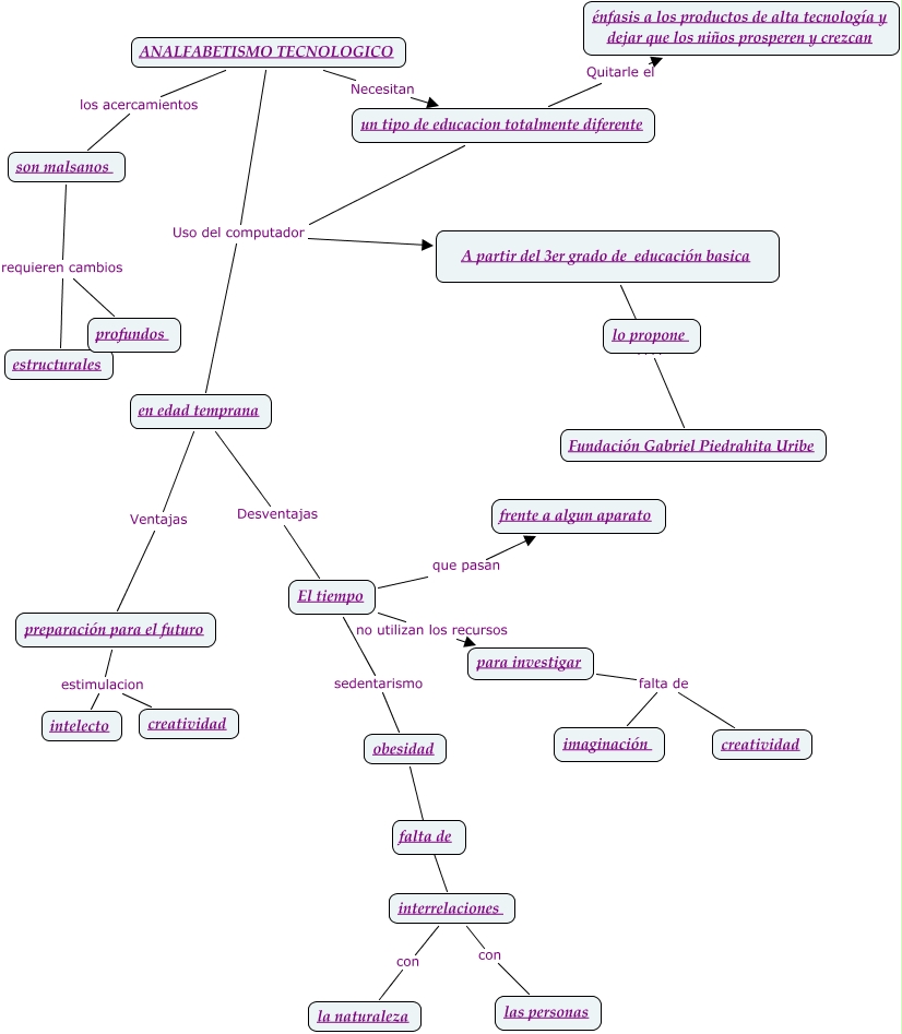 Este Cmap, tiene información relacionada con: TOPICOS TECNOLOGICOS, ANALFABETISMO TECNOLOGICO Necesitan un tipo de educacion totalmente diferente, en edad temprana Desventajas El tiempo, para investigar falta de imaginación, en edad temprana Ventajas preparación para el futuro, interrelaciones con las personas, preparación para el futuro estimulacion creatividad, son malsanos requieren cambios profundos, un tipo de educacion totalmente diferente Uso del computador A partir del 3er grado de educación basica, El tiempo no utilizan los recursos para investigar, obesidad ???? interrelaciones, El tiempo sedentarismo obesidad, A partir del 3er grado de educación basica ???? Fundación Gabriel Piedrahita Uribe, ANALFABETISMO TECNOLOGICO los acercamientos son malsanos, un tipo de educacion totalmente diferente Uso del computador en edad temprana, preparación para el futuro estimulacion intelecto, interrelaciones con la naturaleza, ANALFABETISMO TECNOLOGICO Uso del computador en edad temprana, para investigar falta de creatividad, ANALFABETISMO TECNOLOGICO Uso del computador A partir del 3er grado de educación basica, A partir del 3er grado de educación basica ???? lo propone