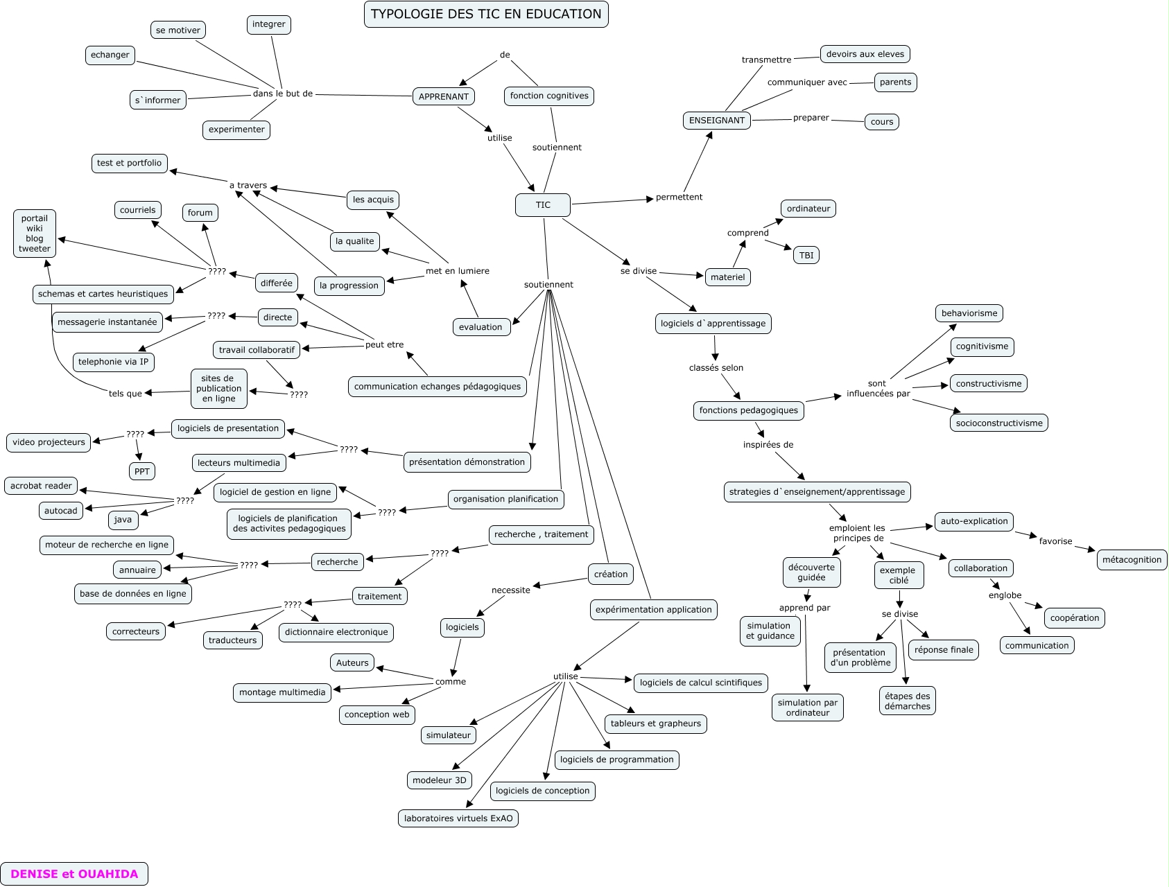 Cette carte de concepts créée avec IHMC CmapTools traite de: typologie2, exemple ciblé se divise présentation d'un problème, travail collaboratif ???? sites de publication en ligne, traitement ???? dictionnaire electronique, lecteurs multimedia ???? autocad, fonctions pedagogiques inspirées de strategies d`enseignement/apprentissage, ENSEIGNANT preparer cours, evaluation met en lumiere les acquis, ENSEIGNANT transmettre devoirs aux eleves, la qualite a travers test et portfolio, APPRENANT dans le but de se motiver, présentation démonstration ???? lecteurs multimedia, TIC soutiennent recherche , traitement, recherche , traitement ???? recherche, differée ???? forum, strategies d`enseignement/apprentissage emploient les principes de exemple ciblé, les acquis a travers test et portfolio, logiciels comme Auteurs, fonctions pedagogiques sont influencées par constructivisme, expérimentation application utilise laboratoires virtuels ExAO, fonction cognitives soutiennent TIC