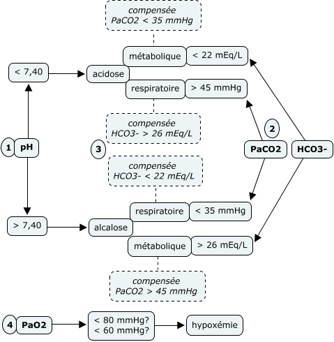 Cette carte de concepts créée avec IHMC CmapTools traite de: Équilibre acidobasique1, pH ???? > 7,40, > 7,40 ???? alcalose, PaO2 ???? < 80 mmHg? < 60 mmHg?, HCO3- ???? < 22 mEq/L, < 7,40 ???? acidose, PaCO2 ???? < 35 mmHg, PaCO2 ???? > 45 mmHg, respiratoire ???? compensée HCO3- < 22 mEq/L, HCO3- ???? > 26 mEq/L, respiratoire ???? compensée HCO3- > 26 mEq/L, pH ???? < 7,40, métabolique ???? compensée PaCO2 > 45 mmHg, < 80 mmHg? < 60 mmHg? ???? hypoxémie, métabolique ???? compensée PaCO2 < 35 mmHg