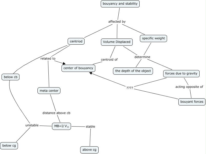 This Concept Map, created with IHMC CmapTools, has information related to: bouyancy and stability, forces due to gravity acting opposite of bouyant forces, centriod related to center of bouyancy, specific weight determine the depth of the object, bouyant forces ???? center of bouyancy, specific weight determine forces due to gravity, meta center distance above cb <math xmlns="http://www.w3.org/1998/Math/MathML"> <mrow> <mtext> MB=I/ </mtext> <mmultiscripts> <mtext> V </mtext> <mtext> D </mtext> <none/> </mmultiscripts> </mrow> </math>, bouyancy and stability affected by centriod, forces due to gravity ???? center of bouyancy, Volume Displaced determine forces due to gravity, centriod unstable below cg, <math xmlns="http://www.w3.org/1998/Math/MathML"> <mrow> <mtext> MB=I/ </mtext> <mmultiscripts> <mtext> V </mtext> <mtext> D </mtext> <none/> </mmultiscripts> </mrow> </math> stable above cg, <math xmlns="http://www.w3.org/1998/Math/MathML"> <mrow> <mtext> MB=I/ </mtext> <mmultiscripts> <mtext> V </mtext> <mtext> D </mtext> <none/> </mmultiscripts> </mrow> </math> unstable below cg, centriod related to meta center, bouyancy and stability affected by specific weight, bouyancy and stability affected by Volume Displaced, Volume Displaced determine the depth of the object