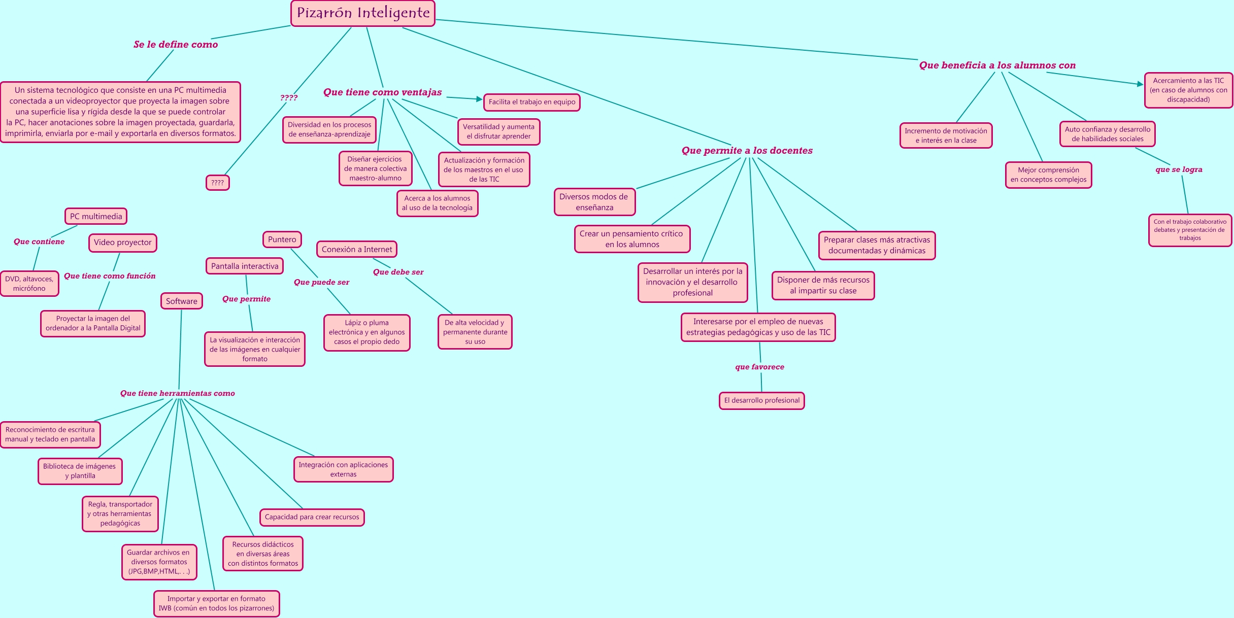 Este Cmap, tiene información relacionada con: Pizarrón-Lore Rgz, Pizarrón Inteligente Que permite a los docentes Disponer de más recursos al impartir su clase, Software Que tiene herramientas como Recursos didácticos en diversas áreas con distintos formatos, Pizarrón Inteligente Que tiene como ventajas Diseñar ejercicios de manera colectiva maestro-alumno, Pizarrón Inteligente Que beneficia a los alumnos con Mejor comprensión en conceptos complejos, Pizarrón Inteligente Que permite a los docentes Interesarse por el empleo de nuevas estrategias pedagógicas y uso de las TIC, Pizarrón Inteligente Que permite a los docentes Desarrollar un interés por la innovación y el desarrollo profesional, Software Que tiene herramientas como Reconocimiento de escritura manual y teclado en pantalla, Pizarrón Inteligente Que beneficia a los alumnos con Auto confianza y desarrollo de habilidades sociales, Pizarrón Inteligente Que tiene como ventajas Acerca a los alumnos al uso de la tecnología, Software Que tiene herramientas como Integración con aplicaciones externas, Software Que tiene herramientas como Importar y exportar en formato IWB (común en todos los pizarrones), Pizarrón Inteligente Que beneficia a los alumnos con Acercamiento a las TIC (en caso de alumnos con discapacidad), Pizarrón Inteligente Que beneficia a los alumnos con Incremento de motivación e interés en la clase, Interesarse por el empleo de nuevas estrategias pedagógicas y uso de las TIC que favorece El desarrollo profesional, Pizarrón Inteligente Que permite a los docentes Preparar clases más atractivas documentadas y dinámicas, Software Que tiene herramientas como Guardar archivos en diversos formatos (JPG,BMP,HTML,. . .), Pizarrón Inteligente Que permite a los docentes Diversos modos de enseñanza, PC multimedia Que contiene DVD, altavoces, micrófono, Video proyector Que tiene como función Proyectar la imagen del ordenador a la Pantalla Digital, Pizarrón Inteligente Que tiene como ventajas Facilita el trabajo en equipo