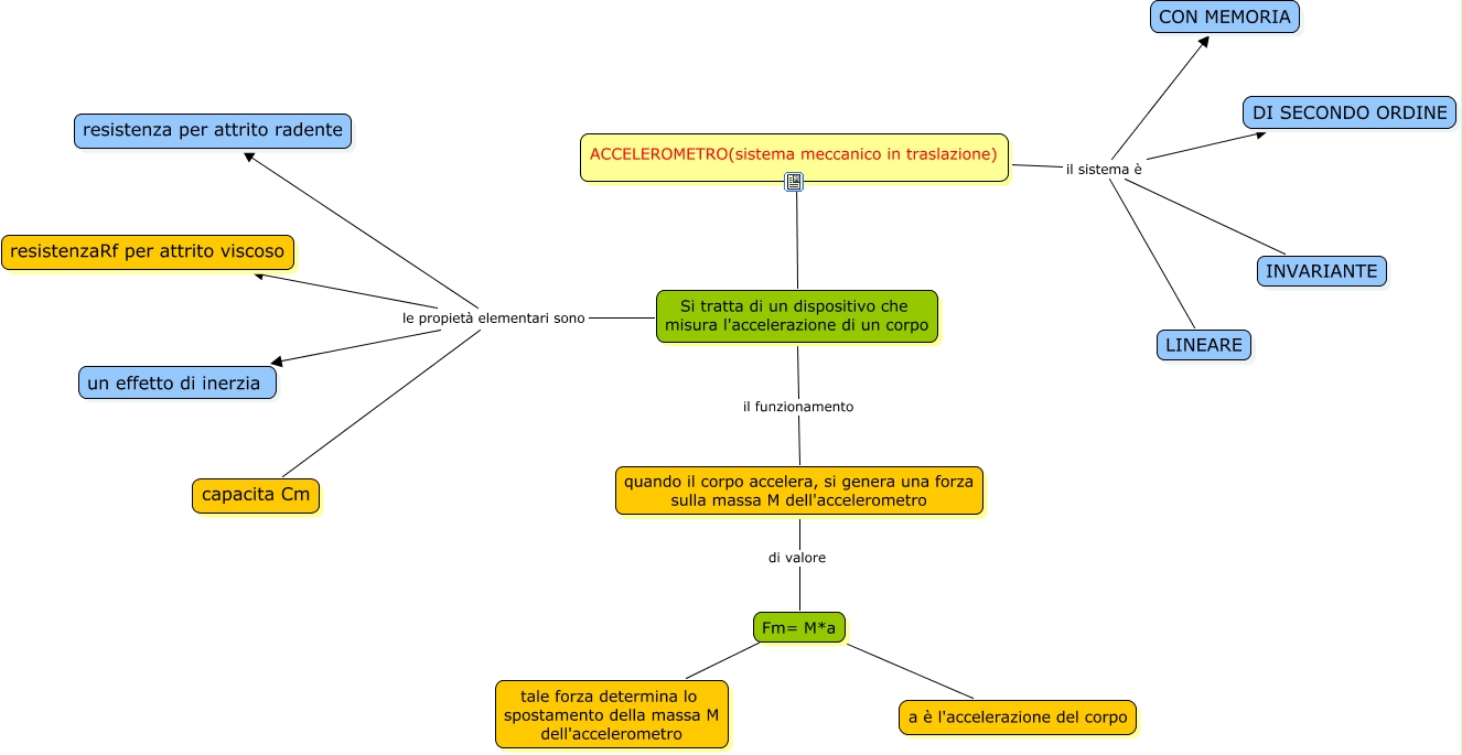 Questa Cmap, creata con IHMC CmapTools, contiene informazioni relative a: Accelerometro, quando il corpo accelera, si genera una forza sulla massa M dell'accelerometro di valore Fm= M*a, ACCELEROMETRO(sistema meccanico in traslazione) il sistema è LINEARE, ACCELEROMETRO(sistema meccanico in traslazione) Si tratta di un dispositivo che misura l'accelerazione di un corpo, Fm= M*a tale forza determina lo spostamento della massa M dell'accelerometro, Si tratta di un dispositivo che misura l'accelerazione di un corpo le propietà elementari sono resistenza per attrito radente, ACCELEROMETRO(sistema meccanico in traslazione) il sistema è CON MEMORIA, Si tratta di un dispositivo che misura l'accelerazione di un corpo le propietà elementari sono capacita Cm, Fm= M*a a è l'accelerazione del corpo, Si tratta di un dispositivo che misura l'accelerazione di un corpo il funzionamento quando il corpo accelera, si genera una forza sulla massa M dell'accelerometro, Si tratta di un dispositivo che misura l'accelerazione di un corpo le propietà elementari sono un effetto di inerzia, ACCELEROMETRO(sistema meccanico in traslazione) il sistema è DI SECONDO ORDINE, ACCELEROMETRO(sistema meccanico in traslazione) il sistema è INVARIANTE, Si tratta di un dispositivo che misura l'accelerazione di un corpo le propietà elementari sono resistenzaRf per attrito viscoso
