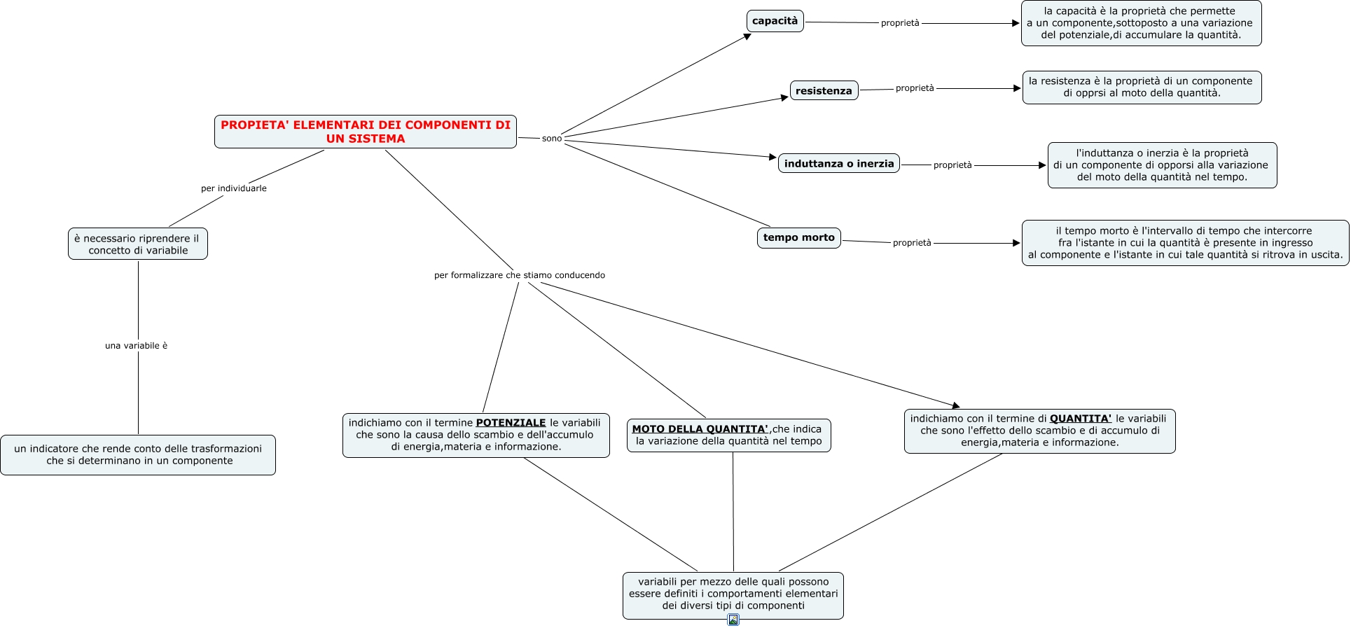 Questa Cmap, creata con IHMC CmapTools, contiene informazioni relative a: PROPIETA' ELEMENTARI DEI COMPONENTI DI UN SISTEMA, PROPIETA' ELEMENTARI DEI COMPONENTI DI UN SISTEMA per formalizzare che stiamo conducendo indichiamo con il termine di QUANTITA' le variabili che sono l'effetto dello scambio e di accumulo di energia,materia e informazione., capacità proprietà la capacità è la proprietà che permette a un componente,sottoposto a una variazione del potenziale,di accumulare la quantità., resistenza proprietà la resistenza è la proprietà di un componente di opprsi al moto della quantità., PROPIETA' ELEMENTARI DEI COMPONENTI DI UN SISTEMA sono tempo morto, MOTO DELLA QUANTITA',che indica la variazione della quantità nel tempo ???? variabili per mezzo delle quali possono essere definiti i comportamenti elementari dei diversi tipi di componenti, PROPIETA' ELEMENTARI DEI COMPONENTI DI UN SISTEMA per formalizzare che stiamo conducendo indichiamo con il termine POTENZIALE le variabili che sono la causa dello scambio e dell'accumulo di energia,materia e informazione., indichiamo con il termine POTENZIALE le variabili che sono la causa dello scambio e dell'accumulo di energia,materia e informazione. ???? variabili per mezzo delle quali possono essere definiti i comportamenti elementari dei diversi tipi di componenti, PROPIETA' ELEMENTARI DEI COMPONENTI DI UN SISTEMA sono induttanza o inerzia, PROPIETA' ELEMENTARI DEI COMPONENTI DI UN SISTEMA sono resistenza, induttanza o inerzia proprietà l'induttanza o inerzia è la proprietà di un componente di opporsi alla variazione del moto della quantità nel tempo., è necessario riprendere il concetto di variabile una variabile è un indicatore che rende conto delle trasformazioni che si determinano in un componente, PROPIETA' ELEMENTARI DEI COMPONENTI DI UN SISTEMA per individuarle è necessario riprendere il concetto di variabile, indichiamo con il termine di QUANTITA' le variabili che sono l'effetto dello scambio e di accumulo di energia,materia e informazione. ???? variabili per mezzo delle quali possono essere definiti i comportamenti elementari dei diversi tipi di componenti, tempo morto proprietà il tempo morto è l'intervallo di tempo che intercorre fra l'istante in cui la quantità è presente in ingresso al componente e l'istante in cui tale quantità si ritrova in uscita., PROPIETA' ELEMENTARI DEI COMPONENTI DI UN SISTEMA per formalizzare che stiamo conducendo MOTO DELLA QUANTITA',che indica la variazione della quantità nel tempo, PROPIETA' ELEMENTARI DEI COMPONENTI DI UN SISTEMA sono capacità