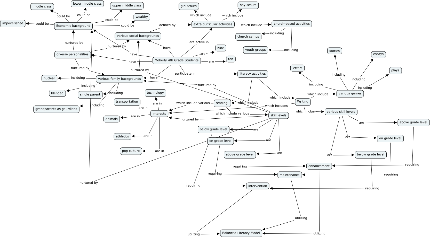 This Concept Map, created with IHMC CmapTools, has information related to: Joanne Smith - Understand 4th graders, reading which include various skill levels, Economic background could be impoverished, reading which include various interests, Moberly 4th Grade Students have Economic background, interests are in pop culture, skill levels nurtured by various social backgrounds, skill levels nurtured by Economic background, diverse personalities nurtured by Economic background, Moberly 4th Grade Students are active in extra curricular activities, diverse personalities nurtured by various family backgrounds, extra curricular activities which include girl scouts, Moberly 4th Grade Students are ten, enhancement utilizing Balanced Literacy Model, various skill levels are below grade level, below grade level requiring intervention, Writing which includes interests, various genres including essays, literacy activities which include reading, below grade level requiring intervention, various social backgrounds defined by extra curricular activities
