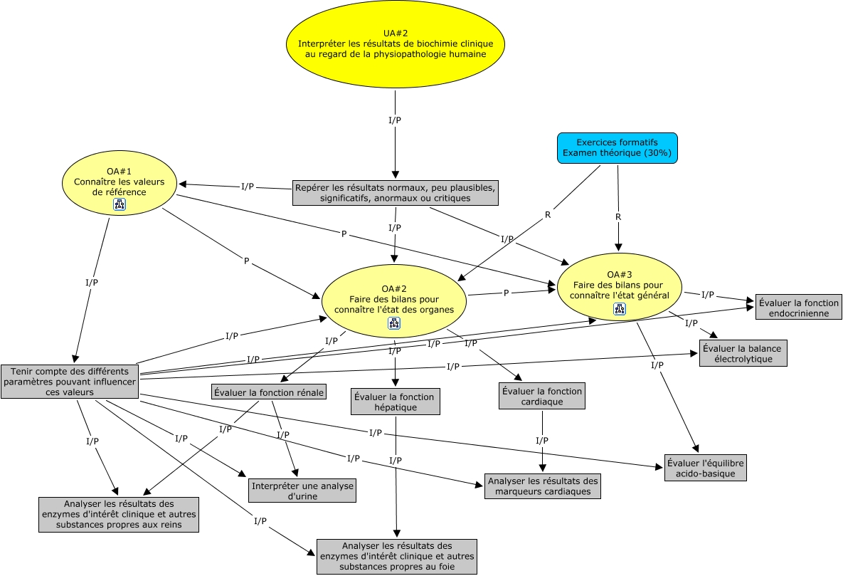 This Concept Map, created with IHMC CmapTools, has information related to: UA2, Tenir compte des différents paramètres pouvant influencer ces valeurs I/P OA#2 Faire des bilans pour connaître l'état des organes, OA#2 Faire des bilans pour connaître l'état des organes I/P Évaluer la fonction rénale, Tenir compte des différents paramètres pouvant influencer ces valeurs I/P Évaluer l'équilibre acido-basique, Évaluer la fonction rénale I/P Interpréter une analyse d'urine, Évaluer la fonction hépatique I/P Analyser les résultats des enzymes d'intérêt clinique et autres substances propres au foie, Tenir compte des différents paramètres pouvant influencer ces valeurs I/P Interpréter une analyse d'urine, Tenir compte des différents paramètres pouvant influencer ces valeurs I/P Évaluer la fonction endocrinienne, Repérer les résultats normaux, peu plausibles, significatifs, anormaux ou critiques I/P OA#3 Faire des bilans pour connaître l'état général, Évaluer la fonction rénale I/P Analyser les résultats des enzymes d'intérêt clinique et autres substances propres aux reins, Repérer les résultats normaux, peu plausibles, significatifs, anormaux ou critiques I/P OA#1 Connaître les valeurs de référence, OA#1 Connaître les valeurs de référence P OA#3 Faire des bilans pour connaître l'état général, Repérer les résultats normaux, peu plausibles, significatifs, anormaux ou critiques I/P OA#2 Faire des bilans pour connaître l'état des organes, OA#3 Faire des bilans pour connaître l'état général I/P Évaluer l'équilibre acido-basique, OA#1 Connaître les valeurs de référence P OA#2 Faire des bilans pour connaître l'état des organes, Tenir compte des différents paramètres pouvant influencer ces valeurs I/P Analyser les résultats des enzymes d'intérêt clinique et autres substances propres au foie, Tenir compte des différents paramètres pouvant influencer ces valeurs I/P Analyser les résultats des marqueurs cardiaques, Exercices formatifs Examen théorique (30%) R OA#2 Faire des bilans pour connaître l'état des organes, OA#2 Faire des bilans pour connaître l'état des organes I/P Évaluer la fonction hépatique, OA#1 Connaître les valeurs de référence I/P Tenir compte des différents paramètres pouvant influencer ces valeurs, UA#2 Interpréter les résultats de biochimie clinique au regard de la physiopathologie humaine I/P Repérer les résultats normaux, peu plausibles, significatifs, anormaux ou critiques