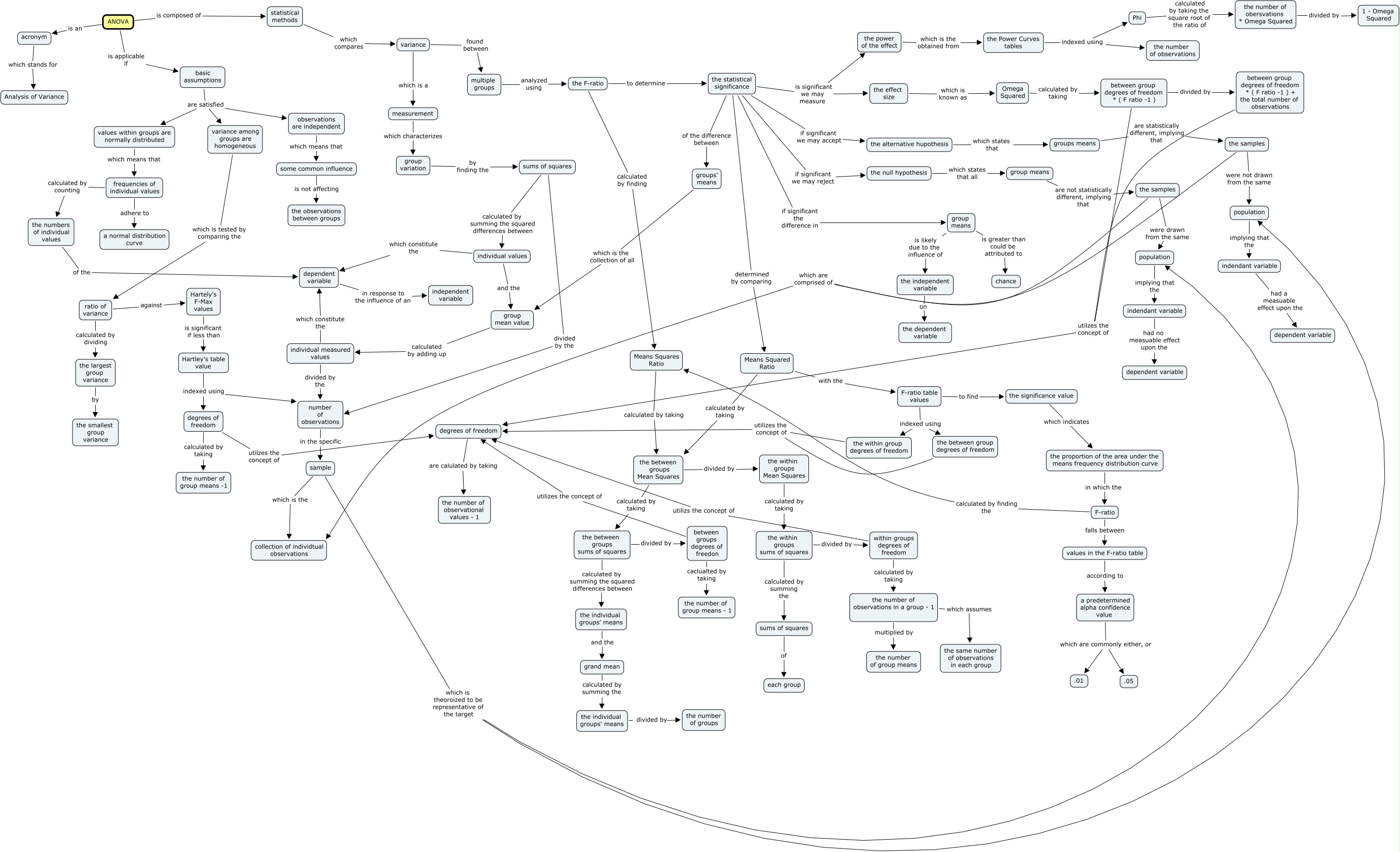 This Concept Map, created with IHMC CmapTools, has information related to: Graber ANOVA, individual measured values divided by the number of observations, the samples which are comprised of collection of individtual observations, the within groups Mean Squares calculated by taking the within groups sums of squares, observations are independent which means that some common influence, between groups degrees of freedon caclualted by taking the number of group means - 1, the statistical significance determined by comparing Means Squared Ratio, the within groups sums of squares calculated by summing the sums of squares, the statistical significance is significant we may measure the power of the effect, the individual groups' means and the grand mean, ratio of variance against Hartely's F-Max values, Hartley's table value indexed using degrees of freedom, ANOVA is composed of statistical methods, ANOVA is an acronym, statistical methods which compares variance, the between groups sums of squares divided by between groups degrees of freedon, Means Squares Ratio calculated by taking the between groups Mean Squares, sums of squares of each group, the statistical significance is significant we may measure the effect size, values within groups are normally distributed which means that frequencies of individual values, the proportion of the area under the means frequency distribution curve in which the F-ratio