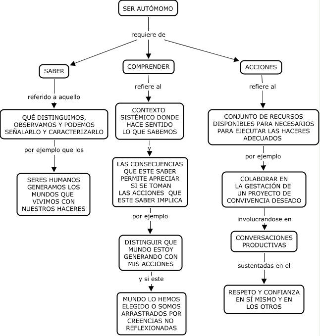 Este Cmap, tiene información relacionada con: SER AUTÓNOMO, COLABORAR EN LA GESTACIÓN DE UN PROYECTO DE CONVIVENCIA DESEADO involucrandose en CONVERSACIONES PRODUCTIVAS, CONJUNTO DE RECURSOS DISPONIBLES PARA NECESARIOS PARA EJECUTAR LAS HACERES ADECUADOS por ejemplo COLABORAR EN LA GESTACIÓN DE UN PROYECTO DE CONVIVENCIA DESEADO, COMPRENDER refiere al CONTEXTO SISTÉMICO DONDE HACE SENTIDO LO QUE SABEMOS, CONVERSACIONES PRODUCTIVAS sustentadas en el RESPETO Y CONFIANZA EN SÍ MISMO Y EN LOS OTROS, CONTEXTO SISTÉMICO DONDE HACE SENTIDO LO QUE SABEMOS y LAS CONSECUENCIAS QUE ESTE SABER PERMITE APRECIAR SI SE TOMAN LAS ACCIONES QUE ESTE SABER IMPLICA, SABER referido a aquello QUÉ DISTINGUIMOS, OBSERVAMOS Y PODEMOS SEÑALARLO Y CARACTERIZARLO, SER AUTÓMOMO requiere de SABER, QUÉ DISTINGUIMOS, OBSERVAMOS Y PODEMOS SEÑALARLO Y CARACTERIZARLO por ejemplo que los SERES HUMANOS GENERAMOS LOS MUNDOS QUE VIVIMOS CON NUESTROS HACERES, LAS CONSECUENCIAS QUE ESTE SABER PERMITE APRECIAR SI SE TOMAN LAS ACCIONES QUE ESTE SABER IMPLICA por ejemplo DISTINGUIR QUE MUNDO ESTOY GENERANDO CON MIS ACCIONES, SER AUTÓMOMO requiere de ACCIONES, DISTINGUIR QUE MUNDO ESTOY GENERANDO CON MIS ACCIONES y si este MUNDO LO HEMOS ELEGIDO O SOMOS ARRASTRADOS POR CREENCIAS NO REFLEXIONADAS, ACCIONES refiere al CONJUNTO DE RECURSOS DISPONIBLES PARA NECESARIOS PARA EJECUTAR LAS HACERES ADECUADOS, SER AUTÓMOMO requiere de COMPRENDER