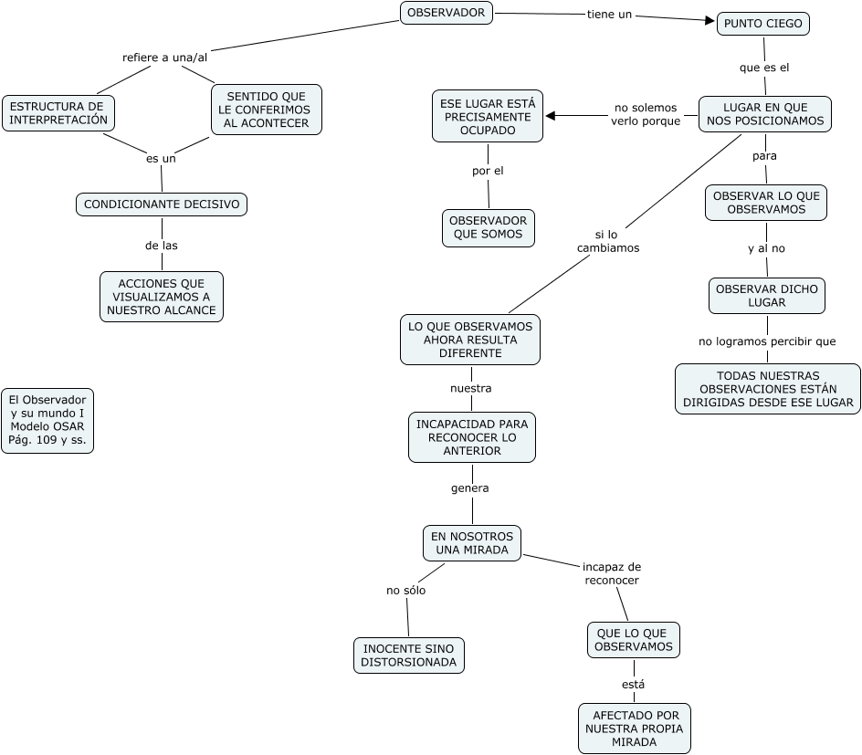 Este Cmap, tiene información relacionada con: OBSERVADOR, ESE LUGAR ESTÁ PRECISAMENTE OCUPADO por el OBSERVADOR QUE SOMOS, ESTRUCTURA DE INTERPRETACIÓN es un CONDICIONANTE DECISIVO, OBSERVAR DICHO LUGAR no logramos percibir que TODAS NUESTRAS OBSERVACIONES ESTÁN DIRIGIDAS DESDE ESE LUGAR, OBSERVAR LO QUE OBSERVAMOS y al no OBSERVAR DICHO LUGAR, OBSERVADOR refiere a una/al ESTRUCTURA DE INTERPRETACIÓN, INCAPACIDAD PARA RECONOCER LO ANTERIOR genera EN NOSOTROS UNA MIRADA, LUGAR EN QUE NOS POSICIONAMOS para OBSERVAR LO QUE OBSERVAMOS, SENTIDO QUE LE CONFERIMOS AL ACONTECER es un CONDICIONANTE DECISIVO, EN NOSOTROS UNA MIRADA no sólo INOCENTE SINO DISTORSIONADA, LUGAR EN QUE NOS POSICIONAMOS no solemos verlo porque ESE LUGAR ESTÁ PRECISAMENTE OCUPADO, PUNTO CIEGO que es el LUGAR EN QUE NOS POSICIONAMOS, LUGAR EN QUE NOS POSICIONAMOS si lo cambiamos LO QUE OBSERVAMOS AHORA RESULTA DIFERENTE, OBSERVADOR tiene un PUNTO CIEGO, EN NOSOTROS UNA MIRADA incapaz de reconocer QUE LO QUE OBSERVAMOS, CONDICIONANTE DECISIVO de las ACCIONES QUE VISUALIZAMOS A NUESTRO ALCANCE, LO QUE OBSERVAMOS AHORA RESULTA DIFERENTE nuestra INCAPACIDAD PARA RECONOCER LO ANTERIOR, OBSERVADOR refiere a una/al SENTIDO QUE LE CONFERIMOS AL ACONTECER, QUE LO QUE OBSERVAMOS está AFECTADO POR NUESTRA PROPIA MIRADA
