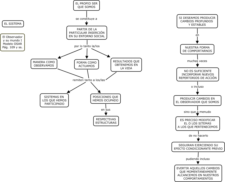 Este Cmap, tiene información relacionada con: Sistemas su influencia sobre el ser que somos, FORMA COMO ACTUAMOS remiten tanto a los/las POSICIONES QUE HEMOS OCUPADO, PARTIR DE LA PARTICULAR INSERCIÓN EN SU ENTORNO SOCIAL por lo tanto la/los RESULTADOS QUE OBTENEMOS EN LA VIDA, RESULTADOS QUE OBTENEMOS EN LA VIDA remiten tanto a los/las POSICIONES QUE HEMOS OCUPADO, PRODUCIR CAMBIOS EN EL OBSERVADOR QUE SOMOS sino que a menudo ES PRECISO MODIFICAR EL O LOS SITEMAS A LOS QUE PERTENECEMOS, SEGUIRAN EJERCIENDO SU EFECTO CONDICIONANTE PREVIO pudiendo incluso EVERTIR AQUELLOS CAMBIOS QUE MOMENTANEAMENTE ALCANCEMOS EN NUESTROS COMPORTAMIENTOS, PARTIR DE LA PARTICULAR INSERCIÓN EN SU ENTORNO SOCIAL por lo tanto la/los MANERA COMO OBSERVAMOS, NO ES SUFICIENTE INCORPORAR NUEVOS REPERTORIOS DE ACCIÓN o incluso PRODUCIR CAMBIOS EN EL OBSERVADOR QUE SOMOS, FORMA COMO ACTUAMOS remiten tanto a los/las SISTEMAS EN LOS QUE HEMOS PARTICIPADO, NUESTRA FORMA DE COMPORTARNOS muchas veces NO ES SUFICIENTE INCORPORAR NUEVOS REPERTORIOS DE ACCIÓN, SI DESEAMOS PRODUCIR CAMBIOS PROFUNDOS Y ESTABLES en NUESTRA FORMA DE COMPORTARNOS, MANERA COMO OBSERVAMOS remiten tanto a los/las SISTEMAS EN LOS QUE HEMOS PARTICIPADO, MANERA COMO OBSERVAMOS remiten tanto a los/las POSICIONES QUE HEMOS OCUPADO, ES PRECISO MODIFICAR EL O LOS SITEMAS A LOS QUE PERTENECEMOS de no hacerlo SEGUIRAN EJERCIENDO SU EFECTO CONDICIONANTE PREVIO, PARTIR DE LA PARTICULAR INSERCIÓN EN SU ENTORNO SOCIAL por lo tanto la/los FORMA COMO ACTUAMOS, POSICIONES QUE HEMOS OCUPADO en sus RESPECTIVAS ESTRUCTURAS, RESULTADOS QUE OBTENEMOS EN LA VIDA remiten tanto a los/las SISTEMAS EN LOS QUE HEMOS PARTICIPADO, EL PROPIO SER QUE SOMOS se constituye a PARTIR DE LA PARTICULAR INSERCIÓN EN SU ENTORNO SOCIAL