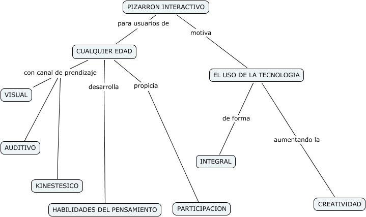 Este Cmap, tiene información relacionada con: PIZARON-ANA OLIVIA A N, EL USO DE LA TECNOLOGIA aumentando la CREATIVIDAD, EL USO DE LA TECNOLOGIA de forma INTEGRAL, CUALQUIER EDAD con canal de prendizaje KINESTESICO, CUALQUIER EDAD con canal de prendizaje VISUAL, PIZARRON INTERACTIVO motiva EL USO DE LA TECNOLOGIA, CUALQUIER EDAD desarrolla HABILIDADES DEL PENSAMIENTO, CUALQUIER EDAD con canal de prendizaje AUDITIVO, PIZARRON INTERACTIVO para usuarios de CUALQUIER EDAD, CUALQUIER EDAD propicia PARTICIPACION