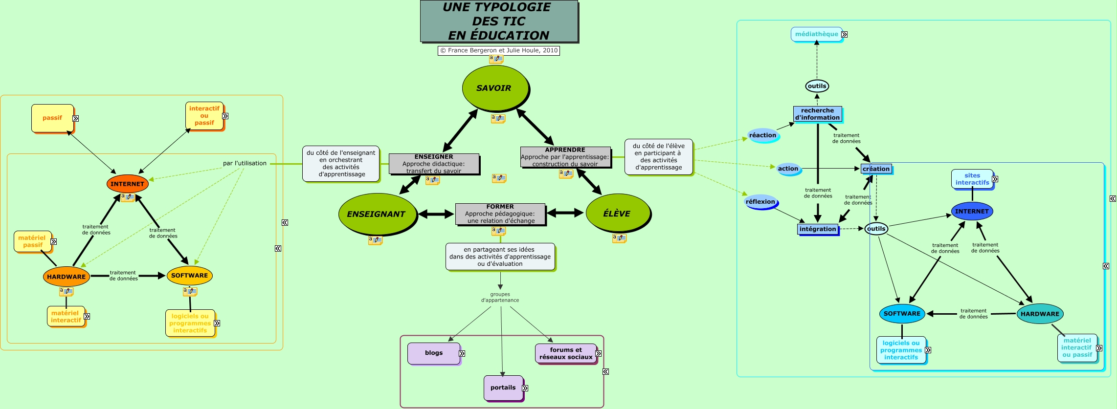 Cette carte de concepts créée avec IHMC CmapTools traite de: Typologie_TIC_Équipe_2_maj_24-02_17h, forums groupes d'appartenance Moodle École polytechnique, recherche d'information traitement de données création, blogs Internet blogger.com, wiki (Wikipédia) interactif MetaWiki, création outils INTERNET, pages web ressources pédagogiques et didactiques Récit ST@R, du côté de l'élève en participant à des activités d'apprentissage réaction recherche d'information, médiathèque bibliothèques Bibliothèque nationale du Qc, médiathèque périodiques Le Devoir, médiathèque périodiques Québec Science, médiathèque périodiques Science et Vie, SOFTWARE interactif support PAO (Publisher), HARDWARE traitement de données INTERNET, SAVOIR APPRENDRE Approche par l'apprentissage: construction du savoir du côté de l'élève en participant à des activités d'apprentissage, SOFTWARE interactif traitement de texte (Word), HARDWARE interactif caméra numérique, intégration outils INTERNET, Moncscoeur.ca serveur courrier Windows Live Hotmail, SOFTWARE interactif traitement de texte (Word), CSBF évaluation BIM