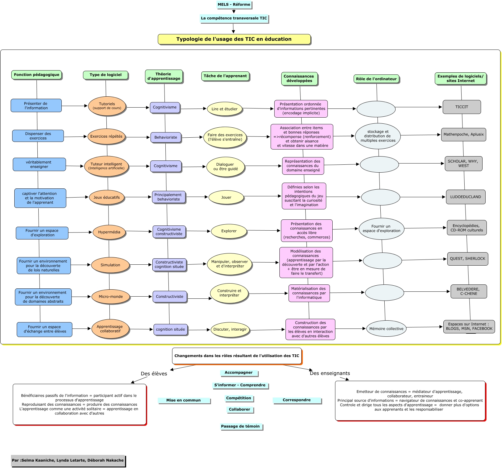 Cette carte de concepts créée avec IHMC CmapTools traite de: Typologie de l'usage des TIC en éducation 2.cmap, Fournir un espace d'échange entre élèves ???? Apprentissage collaboratif, Fournir un environnement pour la découverte de domaines abstraits ???? Micro-monde, Construire et interpréter ???? Matérialisation des connaissances par l'informatique, Présentation des connaissances en accès libre (recherches, commerces) ???? Fournir un espace d'exploration, Dispenser des exercices ???? Exercices répétés, ???? TICCIT, Matérialisation des connaissances par l'informatique ????, Constructiviste ???? Construire et interpréter, Exemples de logiciels/ sites Internet ???? ????, Fonction pédagogique ???? ????, Définies selon les intentions pédagogiques du jeu suscitant la curiosité et l'imagination ????, Fournir un environnement pour la découverte de lois naturelles ???? Simulation, Connaissances développées ???? ????, Tutoriels (support de cours) ???? Cognitivisme, Manipuler, observer et d'interpréter ???? Modélisation des connaissances (apprentissage par la découverte et par l'action + être en mesure de faire le transfert), Discuter, interagir ???? Construction des connaissances par les élèves en interaction avec d'autres élèves, Mémoire collective ???? Espaces sur Internet : BLOGS, MSN, FACEBOOK, ???? LUDOEDUCLAND, Représentation des connaissances du domaine enseigné ????, Théorie d'apprentissage ???? ????