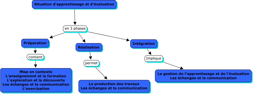 Cette carte de concepts créée avec IHMC CmapTools traite de: SAÉ, Situation d'apprentissage et d'évaluation en 3 phases Préparation, Réalisation permet La production des travaux Les échanges et la communication, Situation d'apprentissage et d'évaluation en 3 phases Intégration, Situation d'apprentissage et d'évaluation en 3 phases Réalisation, Préparation contient Mise en contexte L'enseignement et la formation L'exploration et la découverte Les échanges et la communication L'exercisation, Intégration Implique La gestion de l'apprentissage et de l'évaluation Les échanges et la communication
