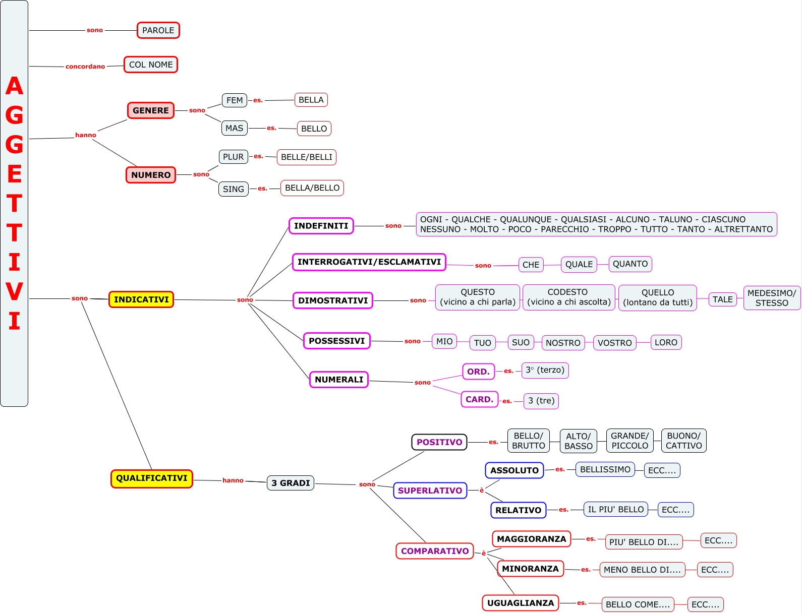 Questa Cmap, creata con IHMC CmapTools, contiene informazioni relative a: GLI AGGETTIVI, INDICATIVI sono POSSESSIVI, ASSOLUTO es. ECC...., UGUAGLIANZA es. ECC...., COMPARATIVO è MINORANZA, POSITIVO es. BUONO/ CATTIVO, A G G E T T I V I sono QUALIFICATIVI, A G G E T T I V I hanno GENERE, INDICATIVI sono DIMOSTRATIVI, RELATIVO es. ECC...., GENERE sono MAS, INDICATIVI sono NUMERALI, A G G E T T I V I sono INDICATIVI, MAS es. BELLO, PLUR es. BELLE/BELLI, NUMERALI sono CARD., SING es. BELLA/BELLO, A G G E T T I V I sono INDICATIVI, 3 GRADI sono POSITIVO, DIMOSTRATIVI sono MEDESIMO/ STESSO, COMPARATIVO è MAGGIORANZA
