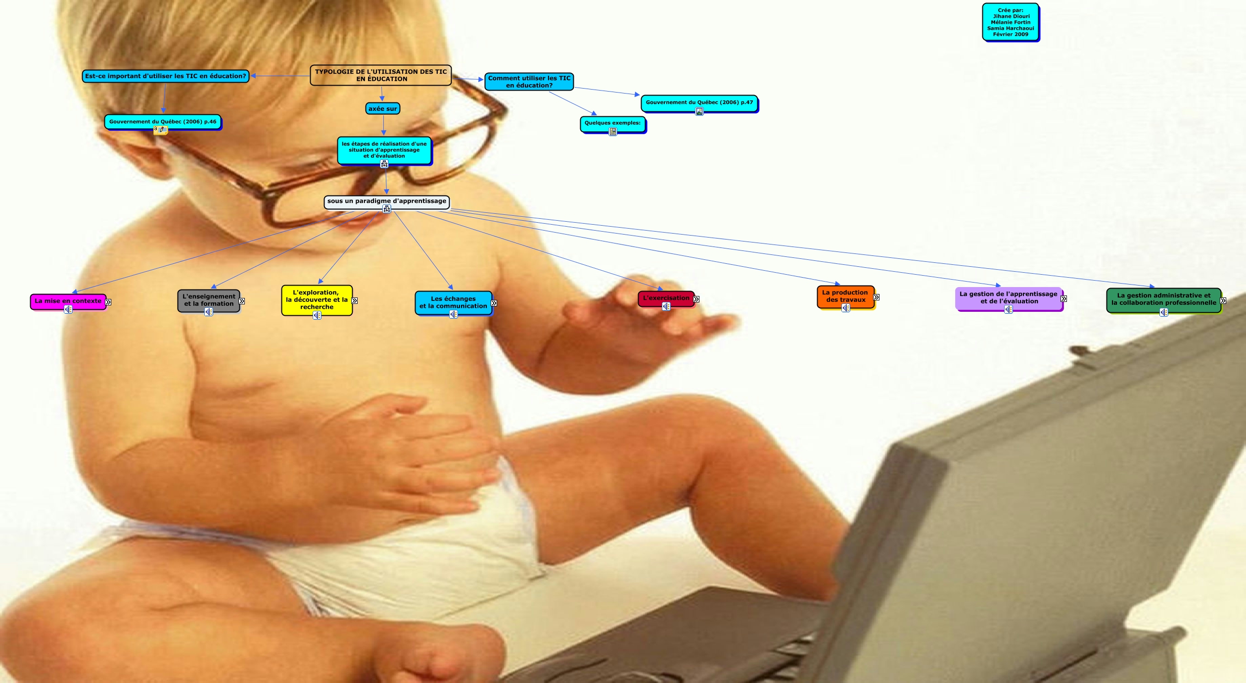 Cette carte de concepts créée avec IHMC CmapTools traite de: 28 fev_21h56_MÉLANIE, L'enseignement et la formation permettent de/d' Objectifs, les étapes de réalisation d'une situation d'apprentissage et d'évaluation sous un paradigme d'apprentissage L'exploration, la découverte et la recherche, L'exercisation utilise Outils, les étapes de réalisation d'une situation d'apprentissage et d'évaluation sous un paradigme d'apprentissage La production des travaux, les étapes de réalisation d'une situation d'apprentissage et d'évaluation sous un paradigme d'apprentissage L'enseignement et la formation, La mise en contexte utilise Outils, La gestion de l'apprentissage et de l'évaluation permet de Objectifs, les étapes de réalisation d'une situation d'apprentissage et d'évaluation sous un paradigme d'apprentissage La gestion de l'apprentissage et de l'évaluation, TYPOLOGIE DE L'UTILISATION DES TIC EN ÉDUCATION Est-ce important d'utiliser les TIC en éducation? Gouvernement du Québec (2006) p.46, Les échanges et la communication utilisent Outils, La production des travaux permet de Objectifs, La gestion de l'apprentissage et de l'évaluation utilise Outils, les étapes de réalisation d'une situation d'apprentissage et d'évaluation sous un paradigme d'apprentissage Les échanges et la communication, La mise en contexte permet de/d' Objectifs, L'enseignement et la formation utilise Outils, L'exploration, la découverte et la recherche permettent de Objectifs, L'exploration, la découverte et la recherche utilisent Outils, Les échanges et la communication permettent de/d' Objectifs, L'exercisation permet de Objectifs, les étapes de réalisation d'une situation d'apprentissage et d'évaluation sous un paradigme d'apprentissage La gestion administrative et la collaboration professionnelle