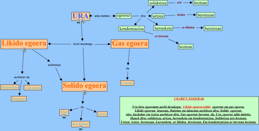 IHMC CmapTools-ekin sortu den kontzeptu-mapa honek honi buruzko informazioa du: ura_sara_ane_sonia_P, egoeraz dira solidotzea, URA Aurki dezakegu Gas egoera, Solido egoera da Kazkabar, URA alda daiteke egoeraz, Likido egoera solidotzea Solido egoera, lurrunketa ur likidoa berotzean, Solido egoera da Elur, Solido egoera da Izotz, Likido egoera aurkitzen da Ibaietan, Likido egoera aurkitzen da Lakuetan, solidotzea ura hoztean, Likido egoera aurkitzen da Itsasoetan, egoeraz dira lurrunketa, egoeraz dira urtzea, egoeraz dira kondentsazioa, urtzea izotza berotzean, URA Aurki dezakegu Likido egoera, URA Aurki dezakegu Solido egoera, kondentsazioa ur lurruna hoztean, Gas egoera da Lurrun