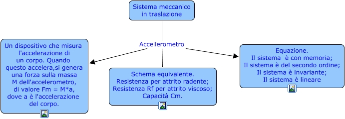 Questa Cmap, creata con IHMC CmapTools, contiene informazioni relative a: Sistema meccanico in traslazione, Sistema meccanico in traslazione Accellerometro Equazione. Il sistema è con memoria; Il sistema è del secondo ordine; Il sistema è invariante; Il sistema è lineare, Sistema meccanico in traslazione Accellerometro Un dispositivo che misura l'accelerazione di un corpo. Quando questo accelera,si genera una forza sulla massa M dell'accelerometro, di valore Fm = M*a, dove a è l'accelerazione del corpo., Sistema meccanico in traslazione Accellerometro Schema equivalente. Resistenza per attrito radente; Resistenza Rf per attrito viscoso; Capacità Cm.