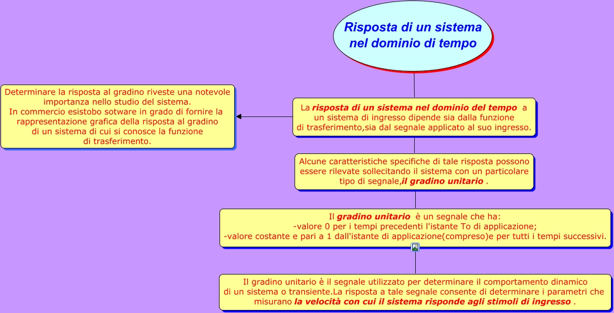 Questa Cmap, creata con IHMC CmapTools, contiene informazioni relative a: Risposta di un sistema nel dominio di tempo, Risposta di un sistema nel dominio di tempo ???? La risposta di un sistema nel dominio del tempo a un sistema di ingresso dipende sia dalla funzione di trasferimento,sia dal segnale applicato al suo ingresso., Il gradino unitario è un segnale che ha: -valore 0 per i tempi precedenti l'istante To di applicazione; -valore costante e pari a 1 dall'istante di applicazione(compreso)e per tutti i tempi successivi. ???? Il gradino unitario è il segnale utilizzato per determinare il comportamento dinamico di un sistema o transiente.La risposta a tale segnale consente di determinare i parametri che misurano la velocità con cui il sistema risponde agli stimoli di ingresso., La risposta di un sistema nel dominio del tempo a un sistema di ingresso dipende sia dalla funzione di trasferimento,sia dal segnale applicato al suo ingresso. ???? Determinare la risposta al gradino riveste una notevole importanza nello studio del sistema. In commercio esistobo sotware in grado di fornire la rappresentazione grafica della risposta al gradino di un sistema di cui si conosce la funzione di trasferimento., La risposta di un sistema nel dominio del tempo a un sistema di ingresso dipende sia dalla funzione di trasferimento,sia dal segnale applicato al suo ingresso. ???? Alcune caratteristiche specifiche di tale risposta possono essere rilevate sollecitando il sistema con un particolare tipo di segnale,il gradino unitario., Alcune caratteristiche specifiche di tale risposta possono essere rilevate sollecitando il sistema con un particolare tipo di segnale,il gradino unitario. ???? Il gradino unitario è un segnale che ha: -valore 0 per i tempi precedenti l'istante To di applicazione; -valore costante e pari a 1 dall'istante di applicazione(compreso)e per tutti i tempi successivi.