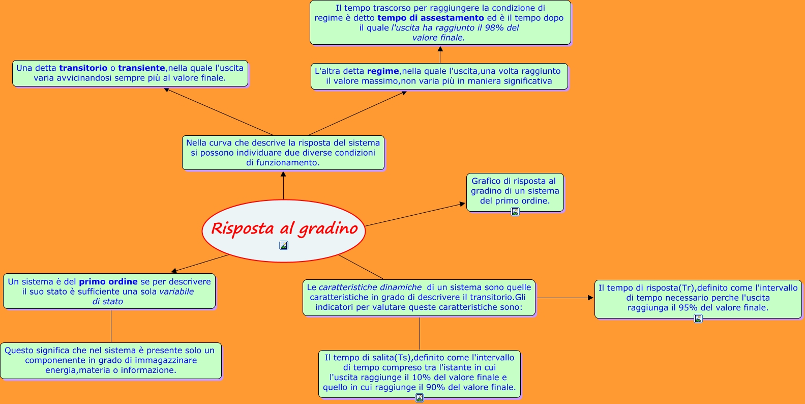 Questa Cmap, creata con IHMC CmapTools, contiene informazioni relative a: Risposta al gradino, Le caratteristiche dinamiche di un sistema sono quelle caratteristiche in grado di descrivere il transitorio.Gli indicatori per valutare queste caratteristiche sono: ???? Il tempo di risposta(Tr),definito come l'intervallo di tempo necessario perche l'uscita raggiunga il 95% del valore finale., L'altra detta regime,nella quale l'uscita,una volta raggiunto il valore massimo,non varia più in maniera significativa ???? Il tempo trascorso per raggiungere la condizione di regime è detto tempo di assestamento ed è il tempo dopo il quale l'uscita ha raggiunto il 98% del valore finale., Le caratteristiche dinamiche di un sistema sono quelle caratteristiche in grado di descrivere il transitorio.Gli indicatori per valutare queste caratteristiche sono: ???? Il tempo di salita(Ts),definito come l'intervallo di tempo compreso tra l'istante in cui l'uscita raggiunge il 10% del valore finale e quello in cui raggiunge il 90% del valore finale., Nella curva che descrive la risposta del sistema si possono individuare due diverse condizioni di funzionamento. ???? Una detta transitorio o transiente,nella quale l'uscita varia avvicinandosi sempre più al valore finale., Risposta al gradino ???? Un sistema è del primo ordine se per descrivere il suo stato è sufficiente una sola variabile di stato, Risposta al gradino ???? Le caratteristiche dinamiche di un sistema sono quelle caratteristiche in grado di descrivere il transitorio.Gli indicatori per valutare queste caratteristiche sono:, Risposta al gradino ???? Grafico di risposta al gradino di un sistema del primo ordine., Nella curva che descrive la risposta del sistema si possono individuare due diverse condizioni di funzionamento. ???? L'altra detta regime,nella quale l'uscita,una volta raggiunto il valore massimo,non varia più in maniera significativa, Risposta al gradino ???? Nella curva che descrive la risposta del sistema si possono individuare due diverse condizioni di funzionamento., Un sistema è del primo ordine se per descrivere il suo stato è sufficiente una sola variabile di stato ???? Questo significa che nel sistema è presente solo un componenente in grado di immagazzinare energia,materia o informazione.