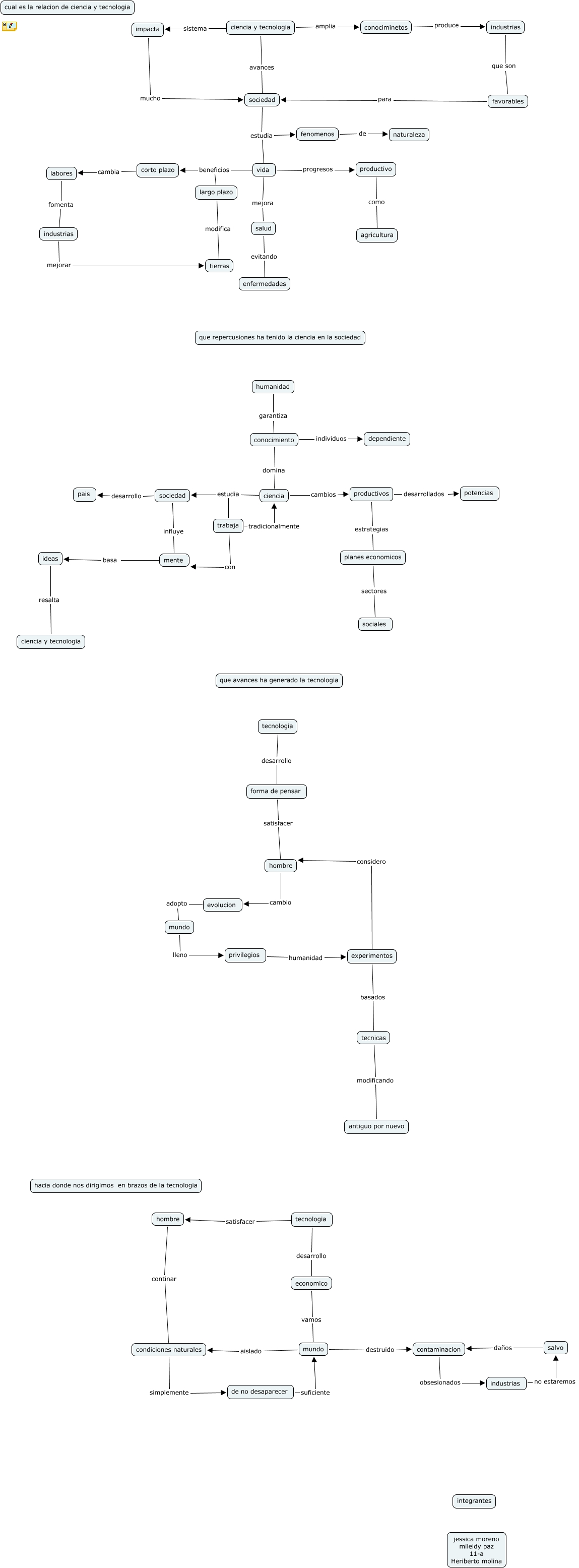 Este Cmap, tiene información relacionada con: ciencia, tecnologia y sociedad, industrias que son favorables, impacta mucho sociedad, tecnologia desarrollo forma de pensar, vida beneficios corto plazo, corto plazo cambia labores, ciencia cambios productivos, vida progresos productivo, conociminetos produce industrias, vida beneficios largo plazo, tecnologia satisfacer hombre, trabaja tradicionalmente ciencia, privilegios humanidad experimentos, salvo daños contaminacion, hombre continar condiciones naturales, largo plazo modifica tierras, sociedad influye mente, ideas resalta ciencia y tecnologia, industrias no estaremos salvo, ciencia y tecnologia amplia conociminetos, productivo como agricultura
