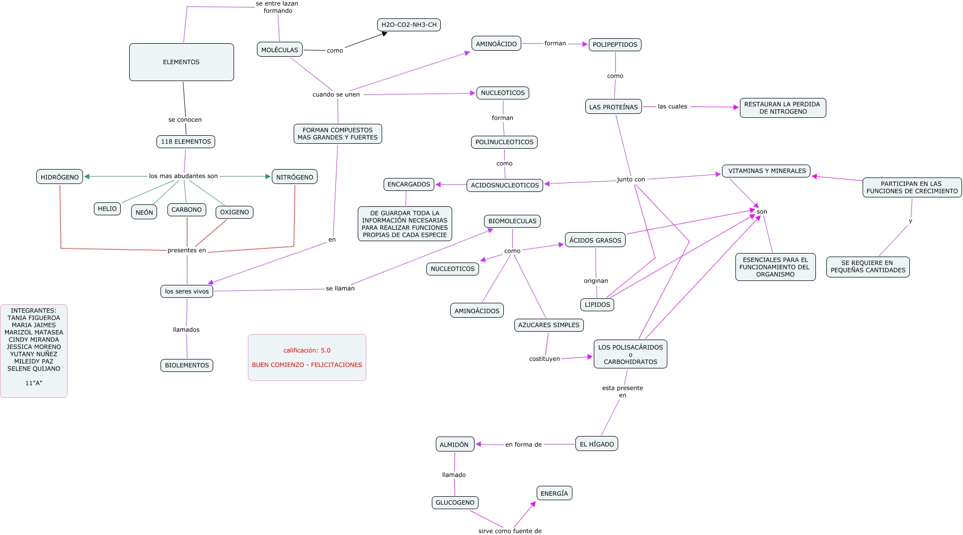 Este Cmap, tiene información relacionada con: BIOQUIMICA.cmap, AMINOÁCIDO forman POLIPEPTIDOS, PARTICIPAN EN LAS FUNCIONES DE CRECIMIENTO ???? VITAMINAS Y MINERALES, POLINUCLEOTICOS como ACIDOSNUCLEOTICOS, POLIPEPTIDOS como LAS PROTEÍNAS, LOS POLISACÁRIDOS o CARBOHIDRATOS esta presente en EL HÍGADO, 118 ELEMENTOS los mas abudantes son OXIGENO, LAS PROTEÍNAS junto con ACIDOSNUCLEOTICOS, ENCARGADOS ???? DE GUARDAR TODA LA INFORMACIÓN NECESARIAS PARA REALIZAR FUNCIONES PROPIAS DE CADA ESPECIE, EL HÍGADO en forma de ALMIDÓN, ELEMENTOS se entre lazan formando MOLÉCULAS, ALMIDÓN llamado GLUCOGENO, ACIDOSNUCLEOTICOS ???? ENCARGADOS, 118 ELEMENTOS los mas abudantes son NITRÓGENO, GLUCOGENO sirve como fuente de ENERGÍA, LIPIDOS junto con LOS POLISACÁRIDOS o CARBOHIDRATOS, LIPIDOS junto con ACIDOSNUCLEOTICOS, los seres vivos llamados BIOLEMENTOS, LAS PROTEÍNAS las cuales RESTAURAN LA PERDIDA DE NITROGENO, BIOMOLECULAS como AMINOÁCIDOS, VITAMINAS Y MINERALES son ESENCIALES PARA EL FUNCIONAMIENTO DEL ORGANISMO