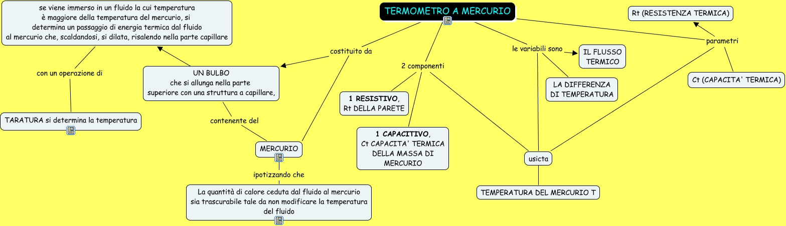 Questa Cmap, creata con IHMC CmapTools, contiene informazioni relative a: TERMOMETRO, usicta ???? TEMPERATURA DEL MERCURIO T, TERMOMETRO A MERCURIO 2 componenti usicta, TERMOMETRO A MERCURIO costituito da MERCURIO, TERMOMETRO A MERCURIO 2 componenti 1 CAPACITIVO, Ct CAPACITA' TERMICA DELLA MASSA DI MERCURIO, se viene immerso in un fluido la cui temperatura è maggiore della temperatura del mercurio, si determina un passaggio di energia termica dal fluido al mercurio che, scaldandosi, si dilata, risalendo nella parte capillare con un operazione di TARATURA si determina la temperatura, TERMOMETRO A MERCURIO parametri Ct (CAPACITA' TERMICA), TERMOMETRO A MERCURIO parametri usicta, TERMOMETRO A MERCURIO le variabili sono LA DIFFERENZA DI TEMPERATURA, UN BULBO che si allunga nella parte superiore con una struttura a capillare, ???? se viene immerso in un fluido la cui temperatura è maggiore della temperatura del mercurio, si determina un passaggio di energia termica dal fluido al mercurio che, scaldandosi, si dilata, risalendo nella parte capillare, TERMOMETRO A MERCURIO costituito da UN BULBO che si allunga nella parte superiore con una struttura a capillare,, TERMOMETRO A MERCURIO parametri Rt (RESISTENZA TERMICA), TERMOMETRO A MERCURIO 2 componenti 1 RESISTIVO, Rt DELLA PARETE, TERMOMETRO A MERCURIO le variabili sono usicta, MERCURIO ipotizzando che La quantità di calore ceduta dal fluido al mercurio sia trascurabile tale da non modificare la temperatura del fluido, TERMOMETRO A MERCURIO le variabili sono IL FLUSSO TERMICO, UN BULBO che si allunga nella parte superiore con una struttura a capillare, contenente del MERCURIO